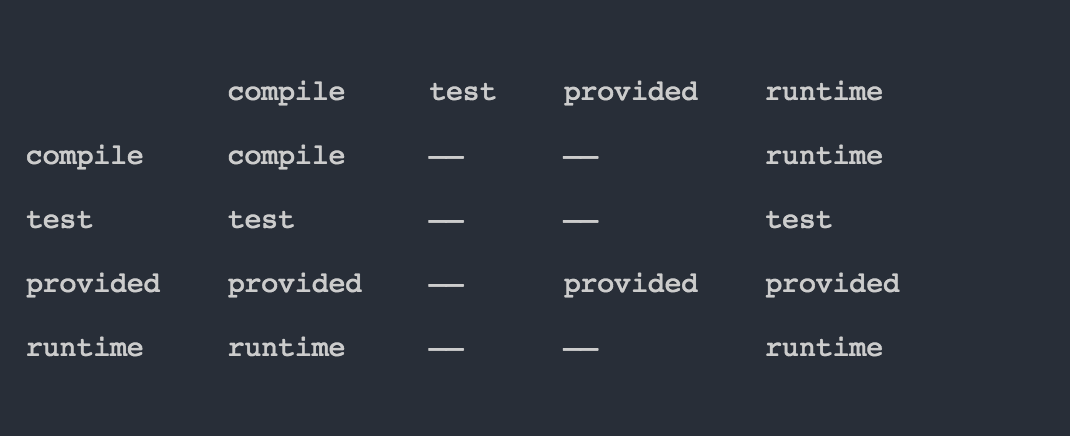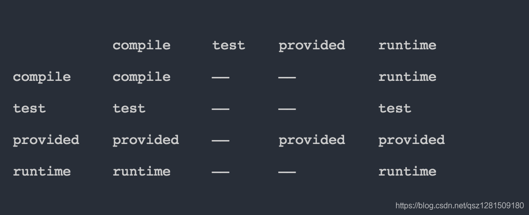 仔细观察上表,可以发现这样一个规律:当第二直接依赖的范围是compile的时候,传递性依赖的范围与第一直接依赖的范围一致;当第二直接依赖的范围是test的时候,依赖不会传递;当第二直接传递依赖的范围是provided的时候,只传递第一直接传递依赖范围也为provided的依赖,其传递性依赖的范围同样是provided;当第二直接依赖的范围是runtime时,传递性依赖的范围与第一直接依赖的范围一致,但除了compile例外,此时传递性依赖的范围为runtime。