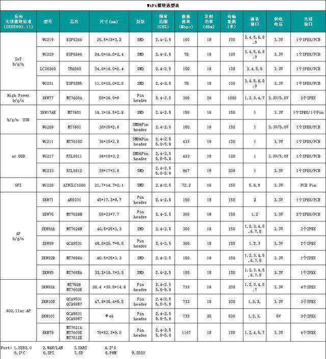 WiFi模块根据工作频段分为2.4GHz单频WiFi模块和2.4/5GHz双频WiFi模块;根据工作模式,分为主设备WiFi模块、从设备WiFi模块;根据应用类型分为AP/Router WiFi模块、UART WiFi模块、USB WiFi模块和大功率WiFi模块。