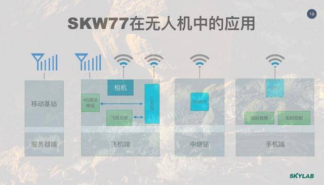 远距离图传、视频传输应用:针对无人机远距离图片、视频实时传输需求,SKYLAB研发推出的大功率WiFi模块SKW77,模块内部集成了双路PA和LNA,每路发射输出功率可达+28dBm以上,最高速率可达300Mbps,能够实现远距离的图传、视频传输及无人机飞控需求。满足物联网各领域中的无人机远距离(1公里)图传和视频传输。
