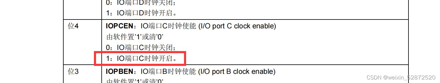 //1、使能GPIOC的时钟 0x4002 1000 + 0x18*(unsigned int *)0x40021018 |= 0x01 << 4;// *(unsigned int *)是先将获得到的GPIOC的时钟地址(此时只是16进制数),转化为地址然后解引用操作。//按位或//0x40021018//假设该地址上的内容为//**** ****//0001 0000//按位或,只将该位的值保证改为1,其他位不变;