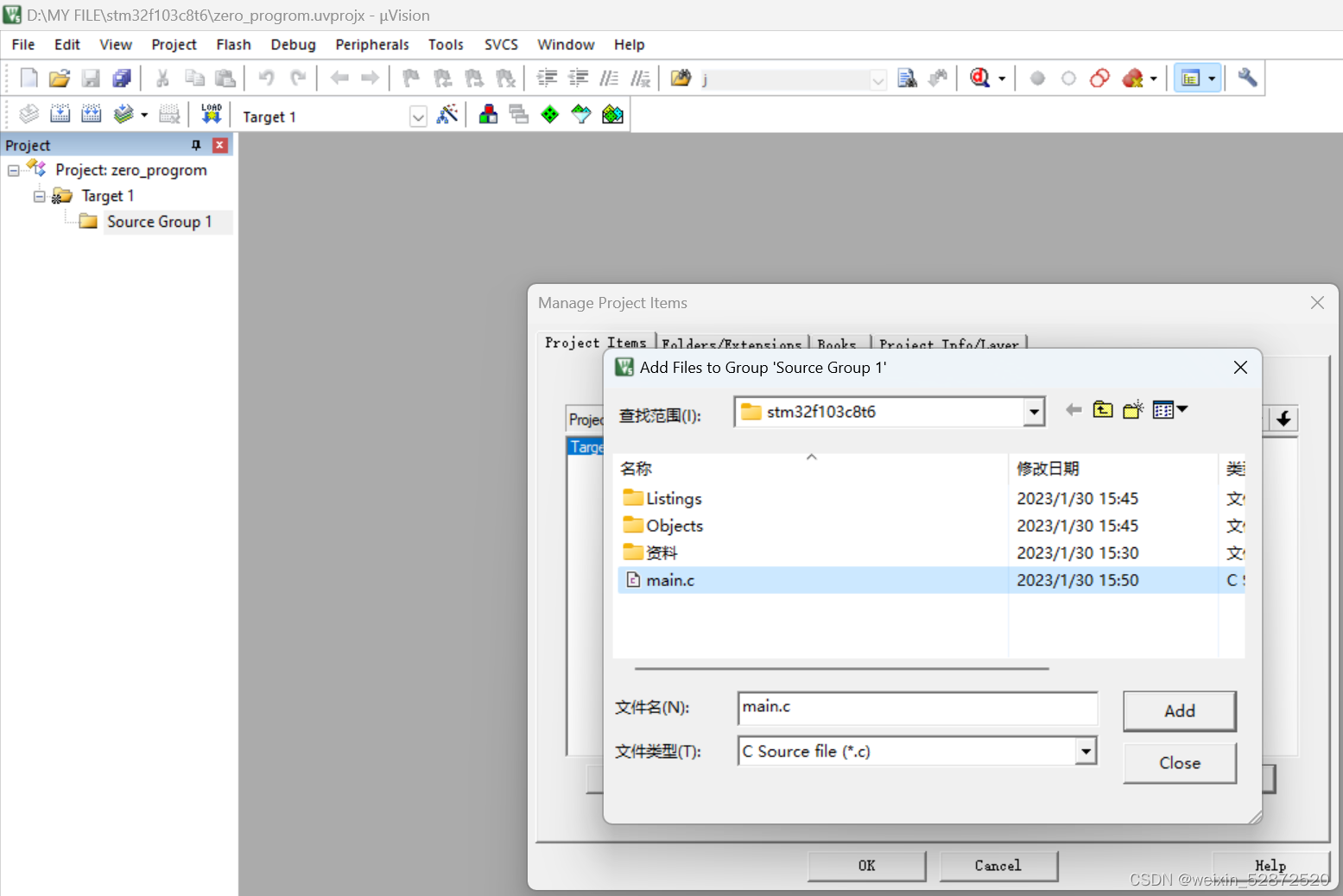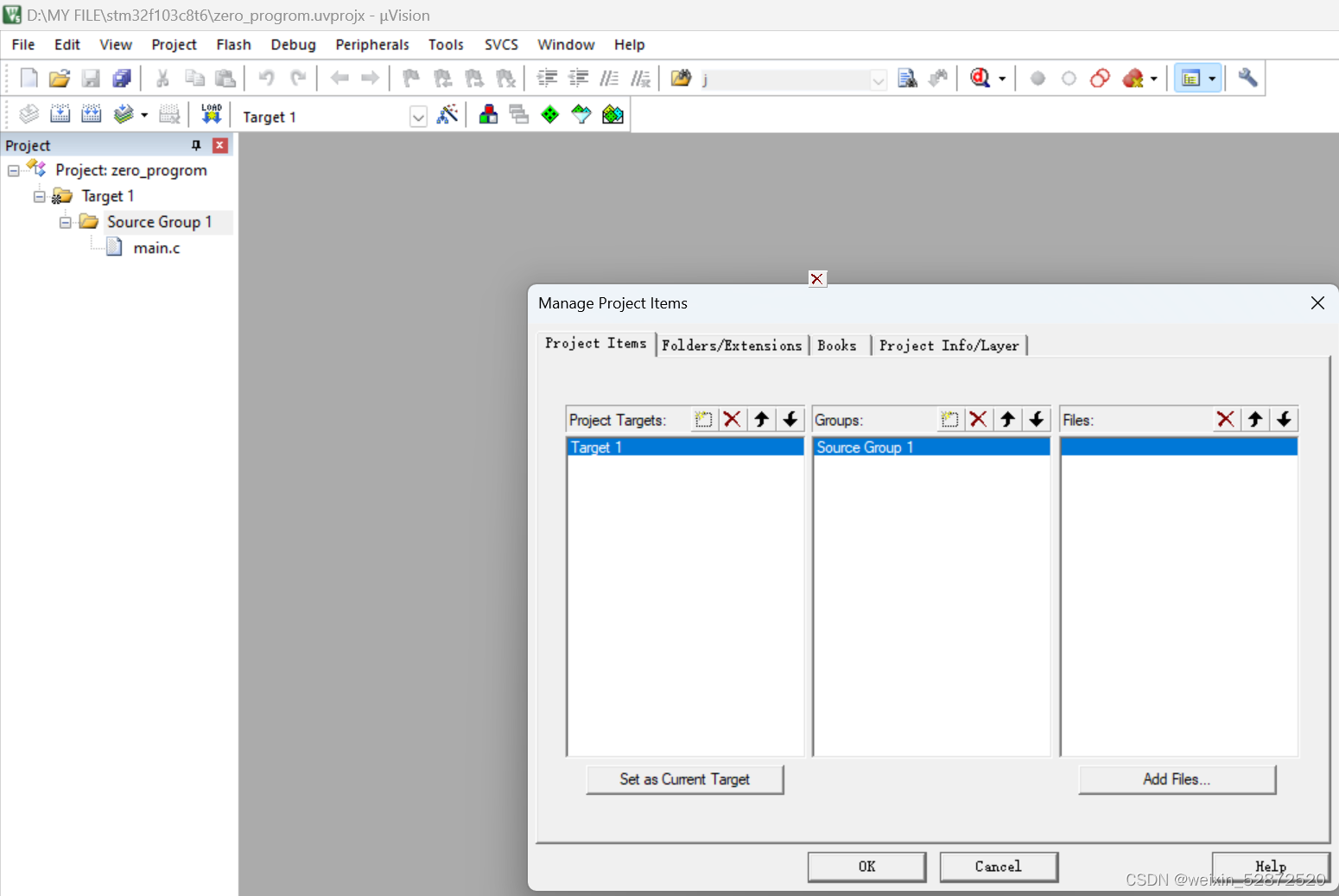 - keil软件项目中手动添加 main.c 文件。右击Source Group 1---->左击Manage progect items...---->在files中,点击 Add filess 添加刚才创建好的main.c文件