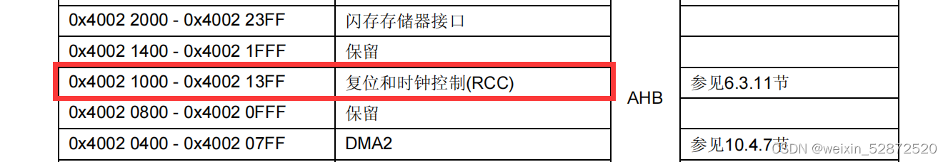 - 在存储器映像中找到AHB总线复位和时钟控制(RCC)外设的的起始地址 0x40021000