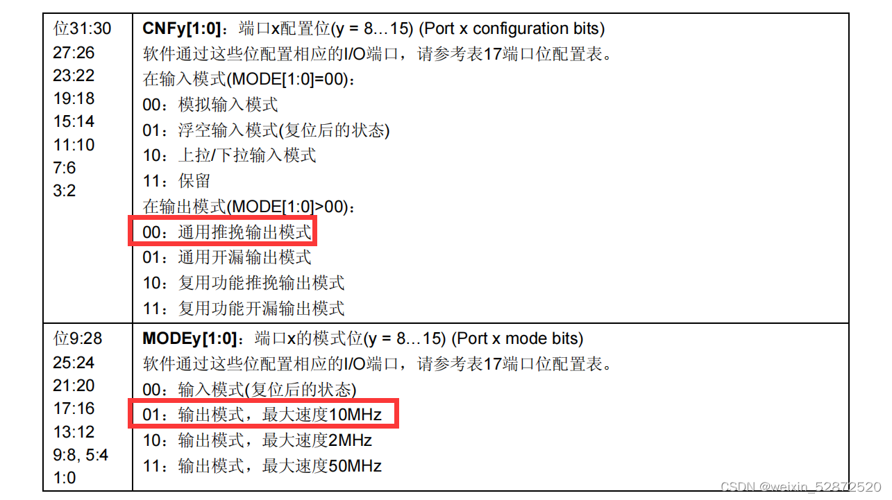 2、配置GPIOC13端口为输出模式(端口配置寄存器)。