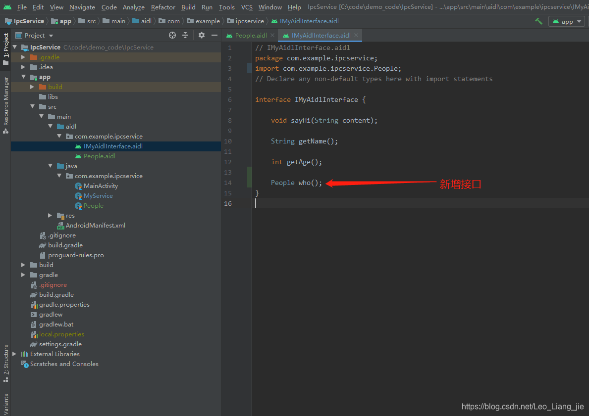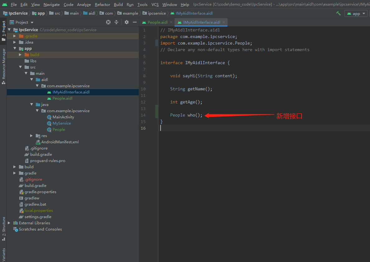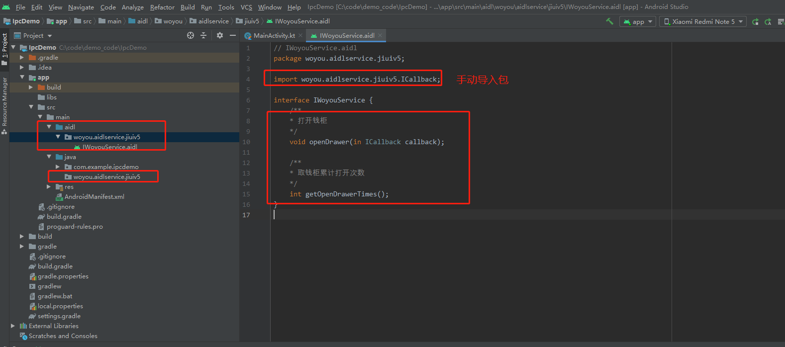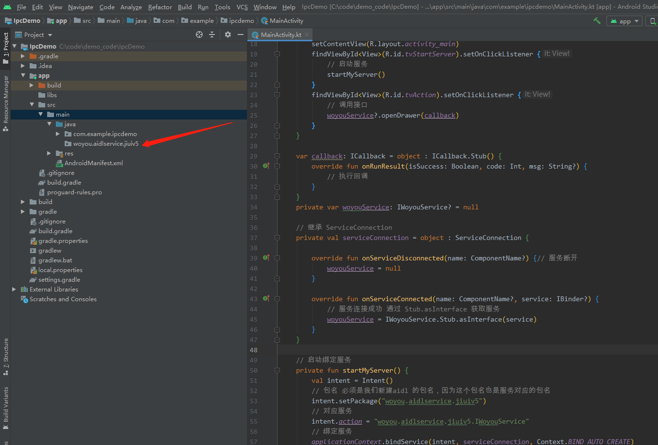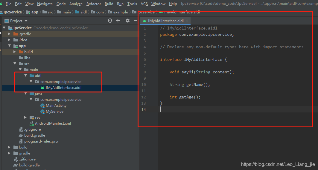 新建好了,Studio 出现 aidl 目录,有对应我们刚新建的 aidl文件,新建的 IWoyouService.aidl 会有默认的接口。我们删除掉,写上服务器提供的接口