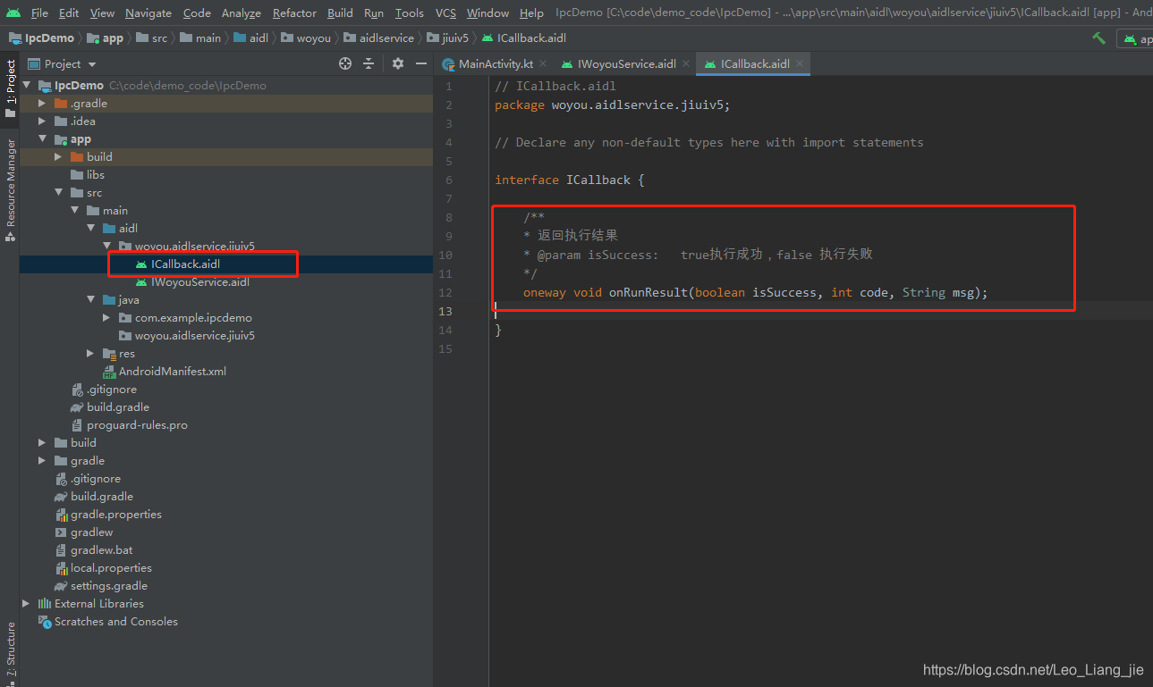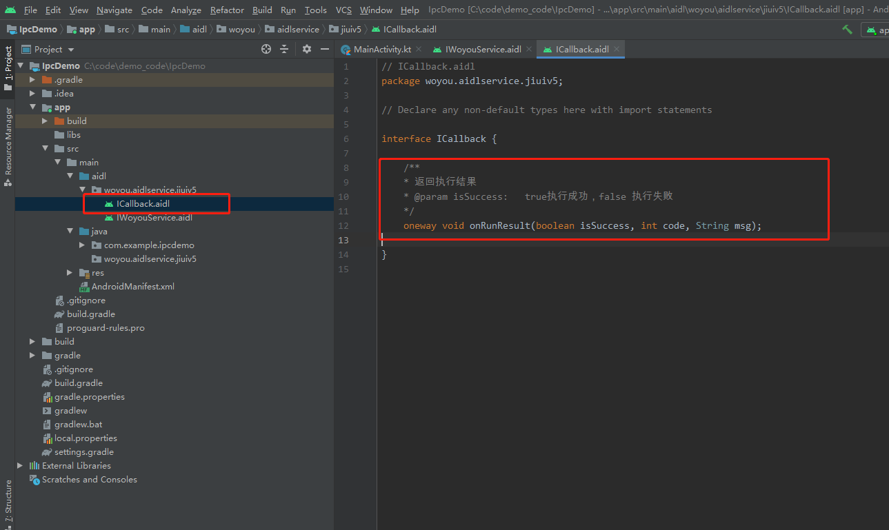 interface ICallback {/*** 返回执行结果* @param isSuccess: true执行成功,false 执行失败*/oneway void onRunResult(boolean isSuccess, int code, String msg);}