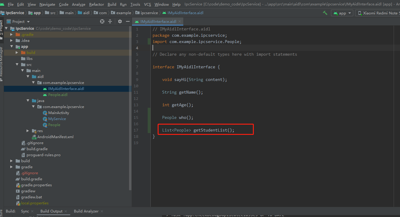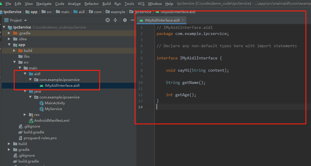 package com.example.ipcservice;// Declare any non-default types here with import statementsinterface IMyAidlInterface {void sayHi(String content);String getName();int getAge();
