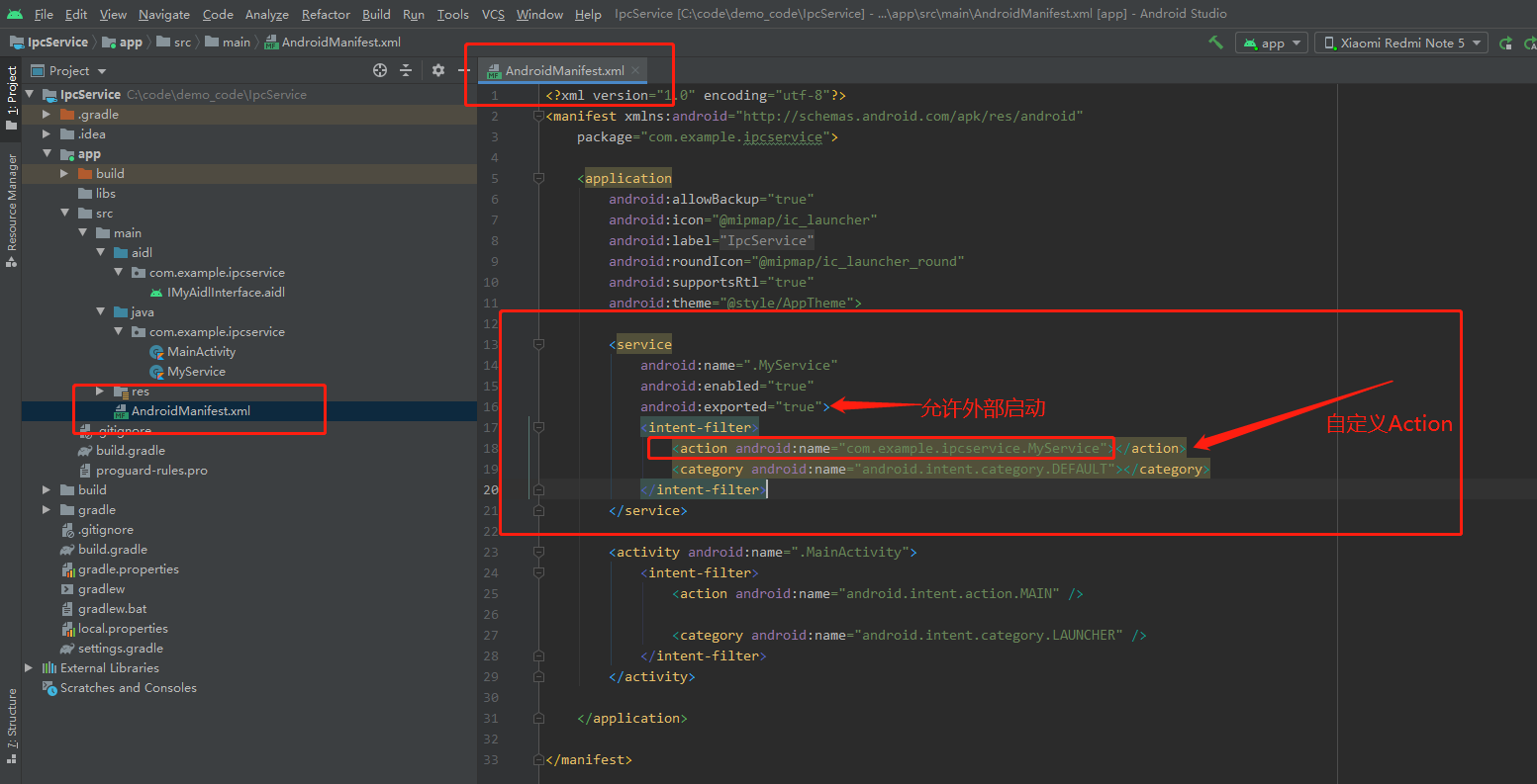 为了更方面明显的显示是进程通讯,我把Client 和 Service 分别单独写作一个App 里面,