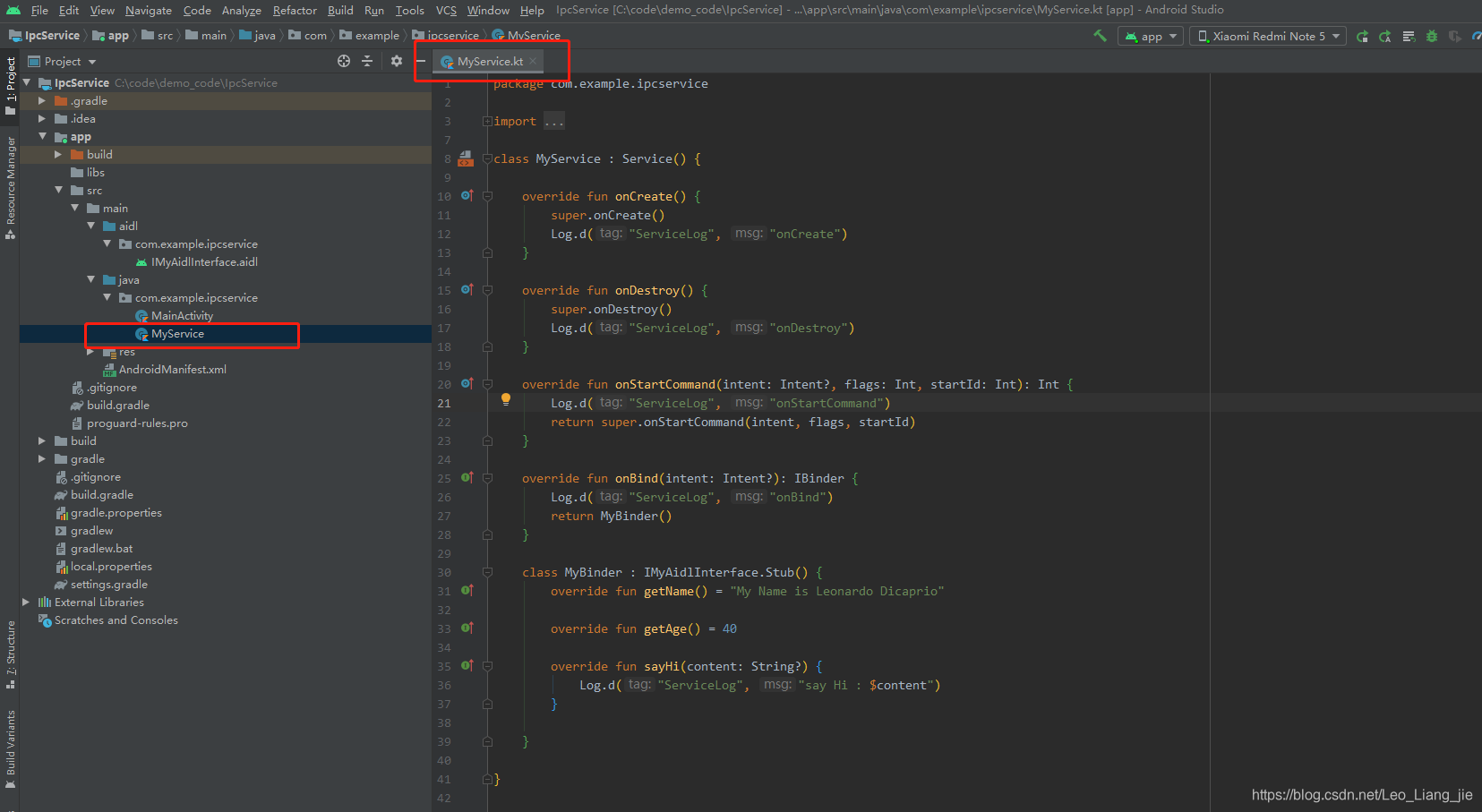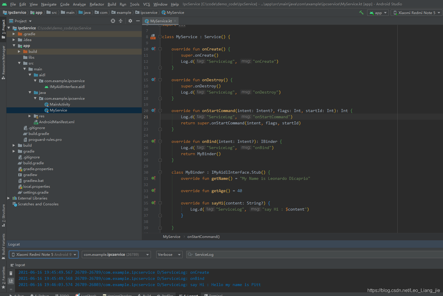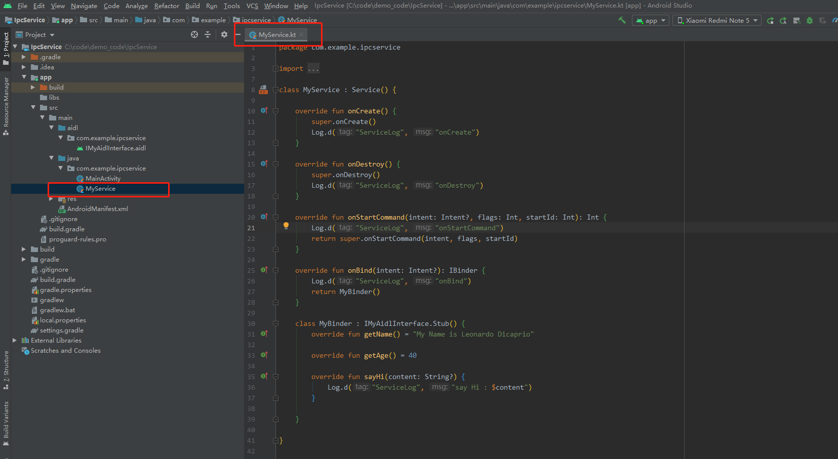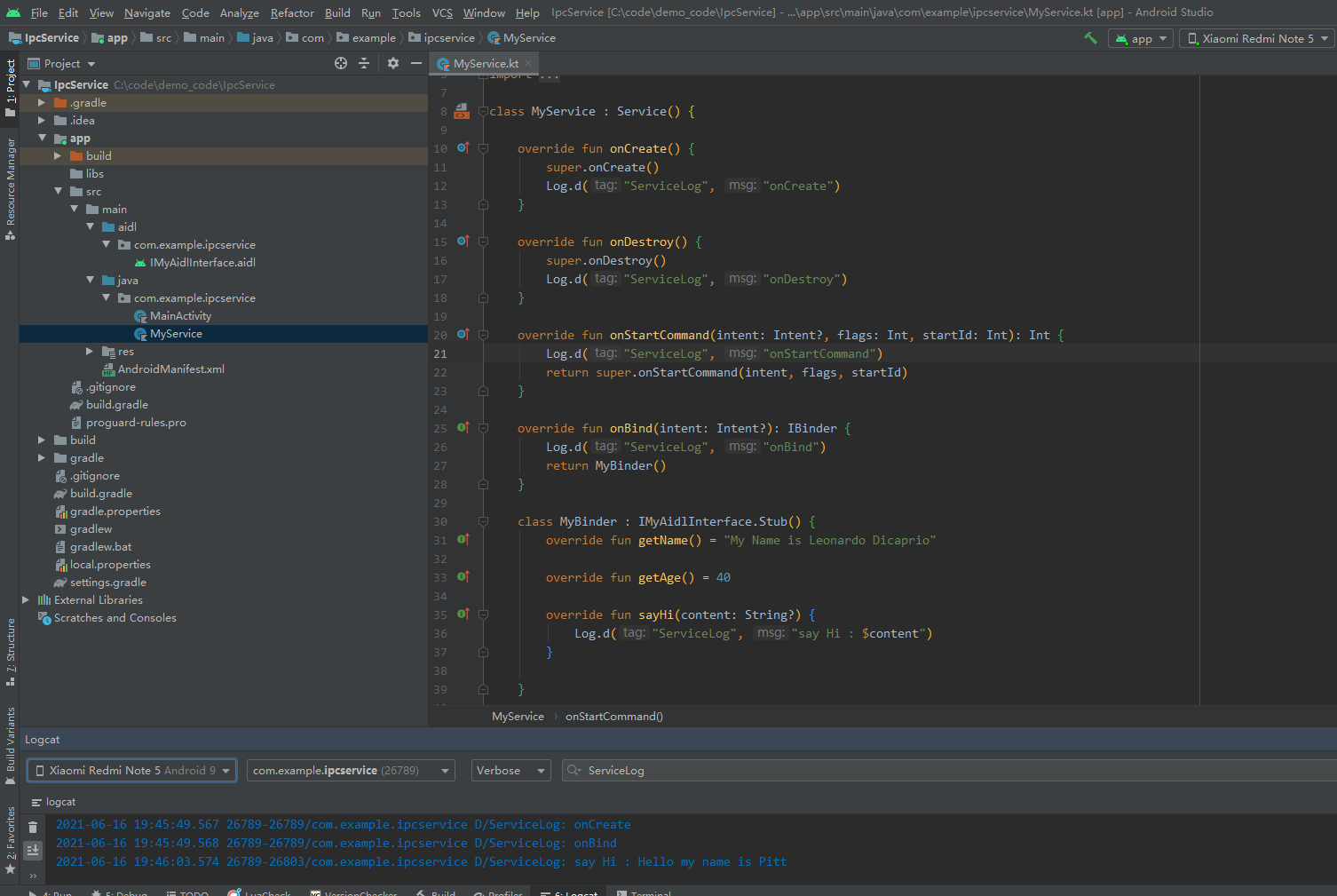 import android.util.Logclass MyService : Service() {override fun onCreate() {super.onCreate()Log.d("ServiceLog", "onCreate")}override fun onDestroy() {super.onDestroy()Log.d("ServiceLog", "onDestroy")}override fun onStartCommand(intent: Intent?, flags: Int, startId: Int): Int {Log.d("ServiceLog", "onStartCommand")return super.onStartCommand(intent, flags, startId)}override fun onBind(intent: Intent?): IBinder {Log.d("ServiceLog", "onBind")return MyBinder()}class MyBinder : IMyAidlInterface.Stub() {override fun getName() = "My Name is Leonardo Dicaprio"override fun getAge() = 40override fun sayHi(content: String?) {Log.d("ServiceLog", "say Hi : $content")}}}