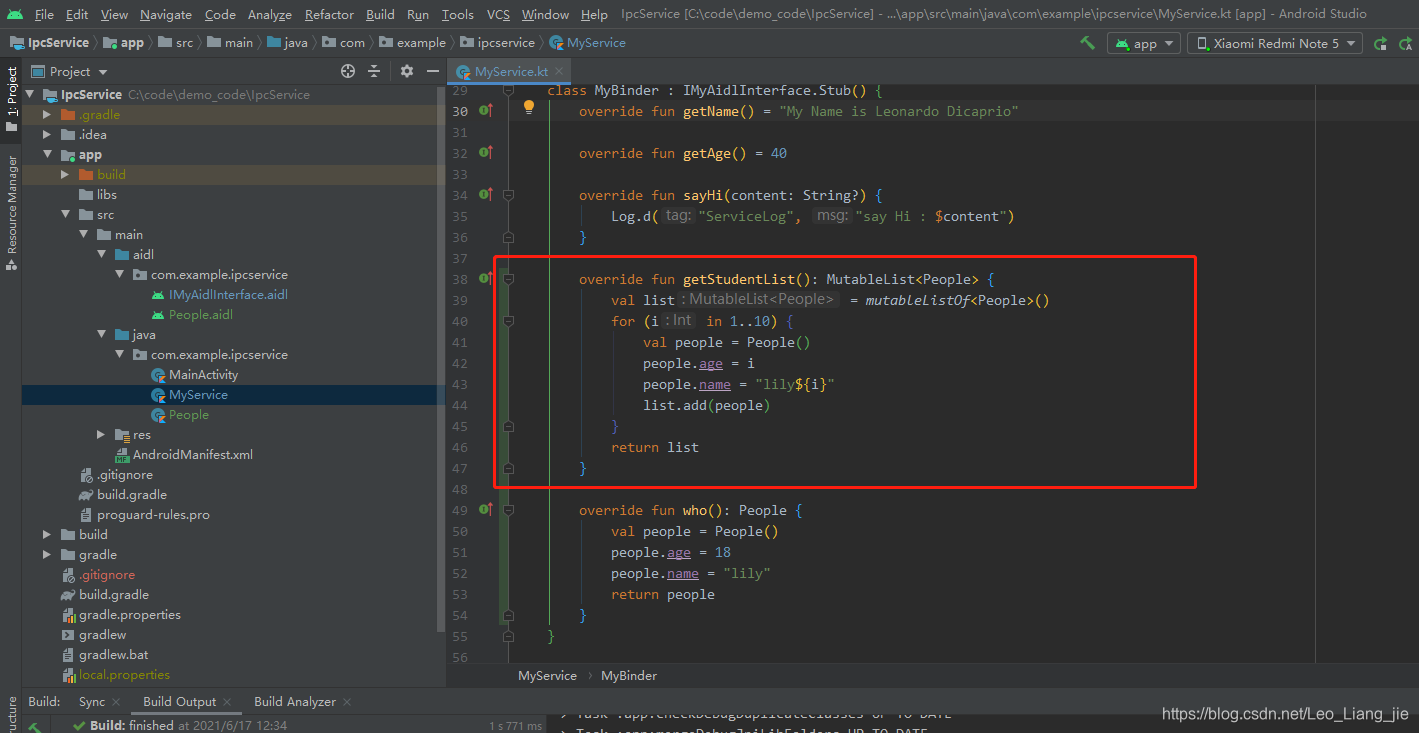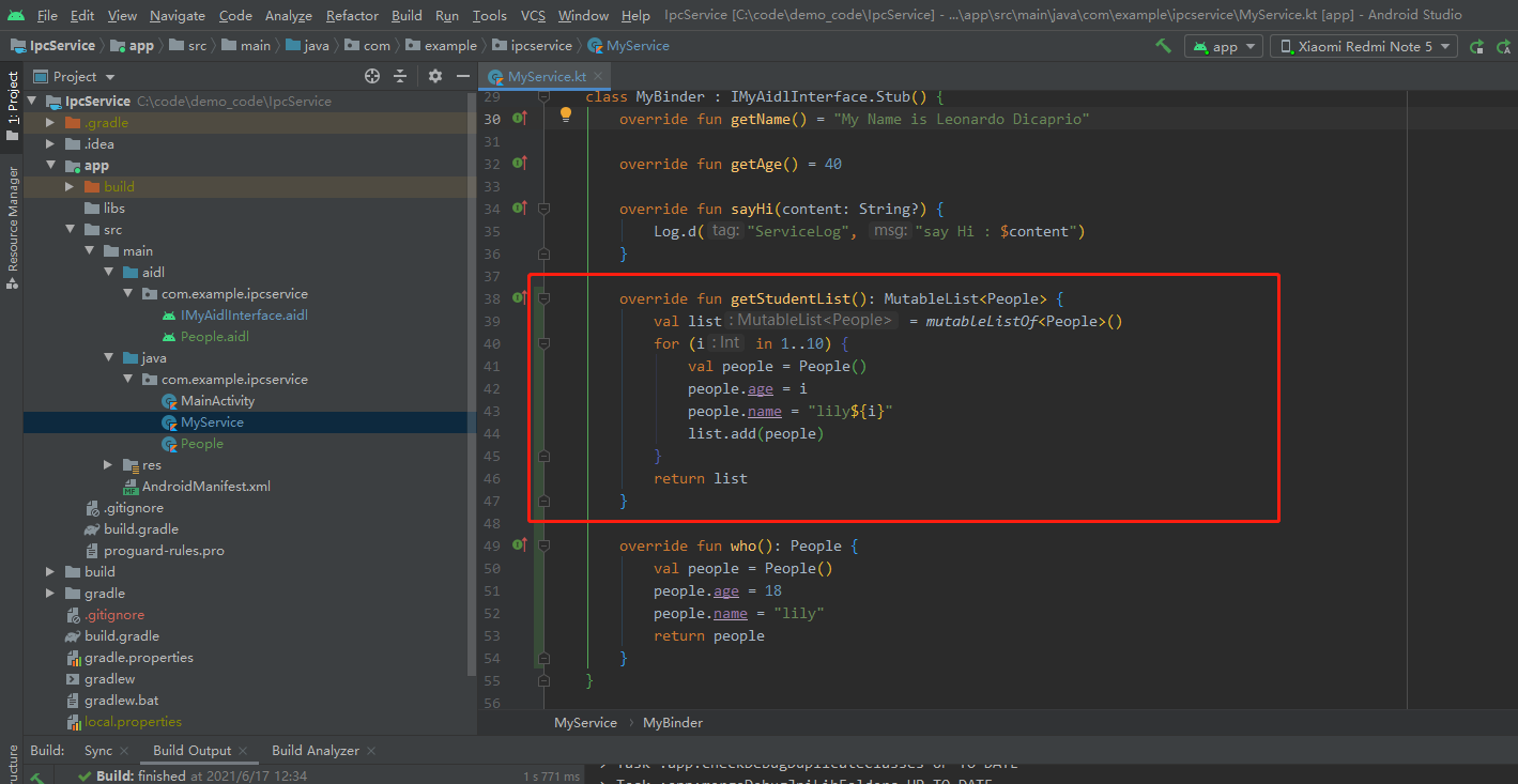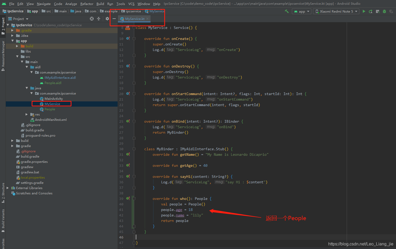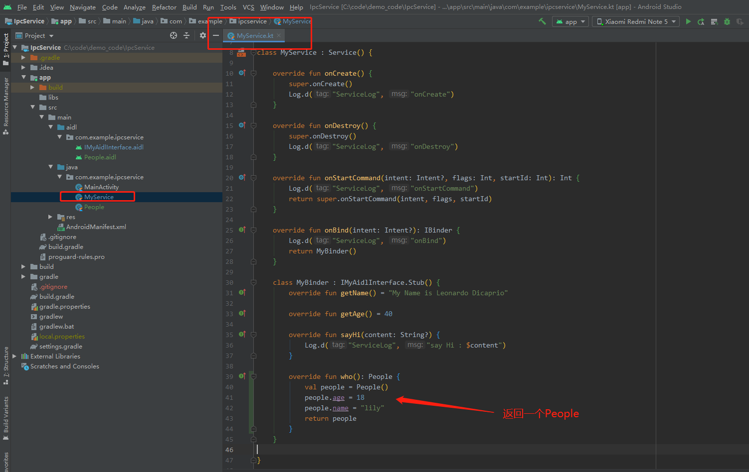 import android.util.Logclass MyService : Service() {override fun onCreate() {super.onCreate()Log.d("ServiceLog", "onCreate")}override fun onDestroy() {super.onDestroy()Log.d("ServiceLog", "onDestroy")}override fun onStartCommand(intent: Intent?, flags: Int, startId: Int): Int {Log.d("ServiceLog", "onStartCommand")return super.onStartCommand(intent, flags, startId)}override fun onBind(intent: Intent?): IBinder {Log.d("ServiceLog", "onBind")return MyBinder()}class MyBinder : IMyAidlInterface.Stub() {override fun getName() = "My Name is Leonardo Dicaprio"override fun getAge() = 40override fun sayHi(content: String?) {Log.d("ServiceLog", "say Hi : $content")}}}