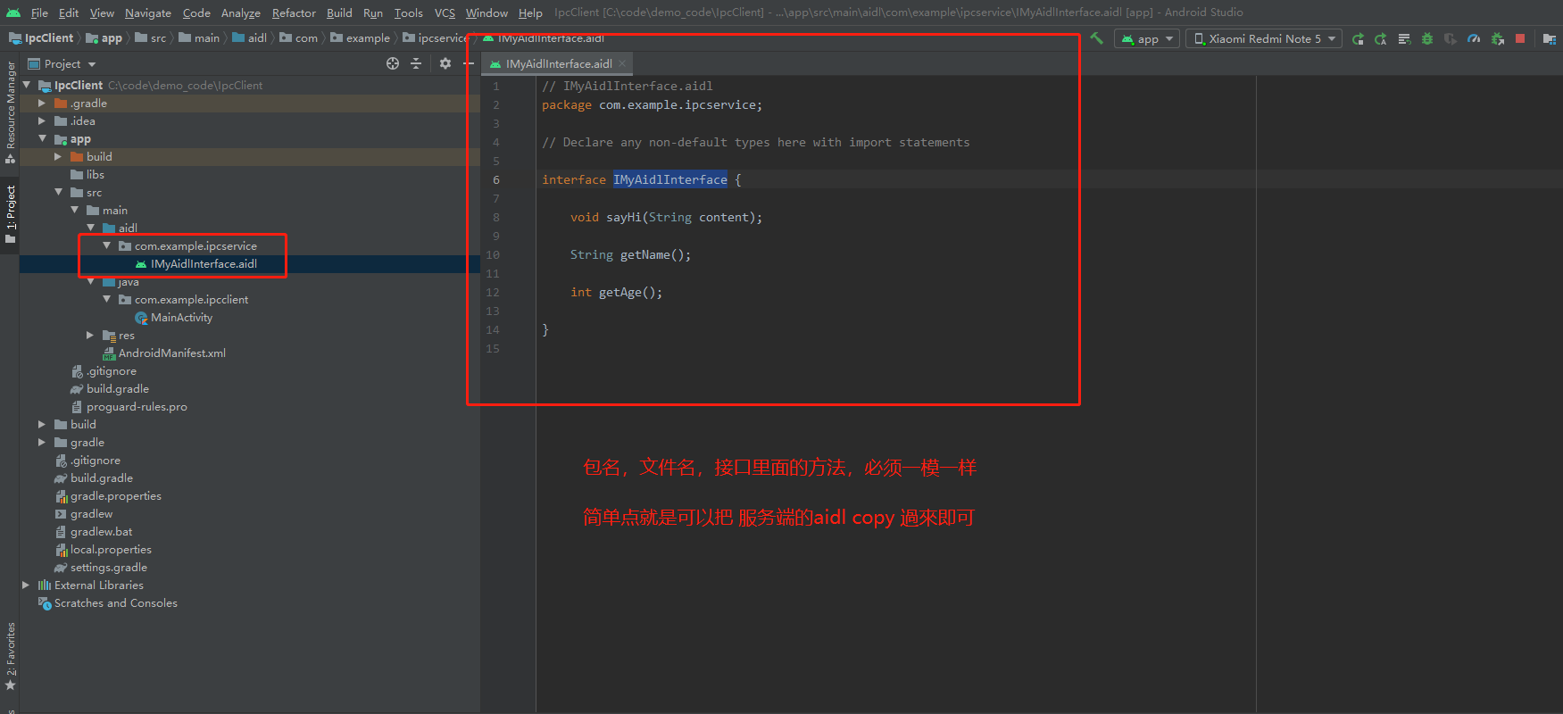 客户端直接Copy服务端的 IMyAidlInterface.aidl 即可