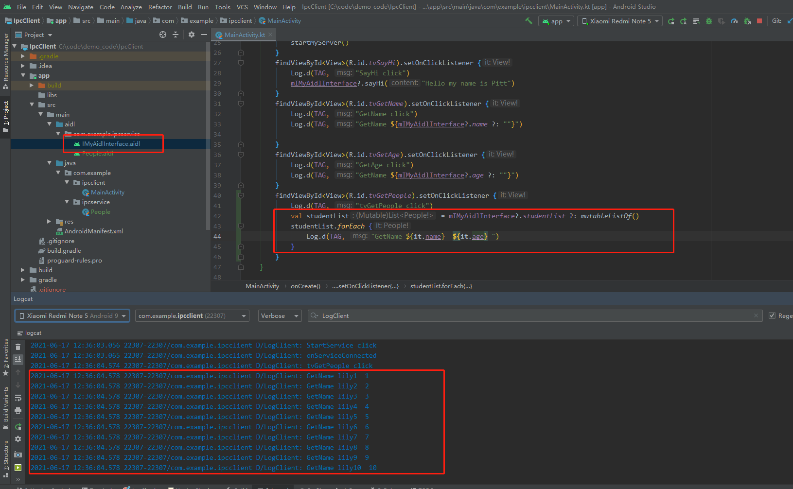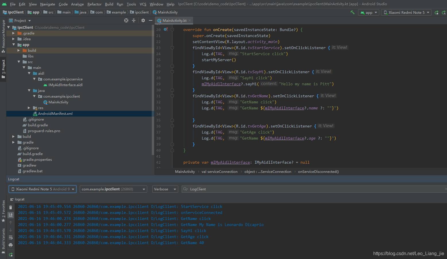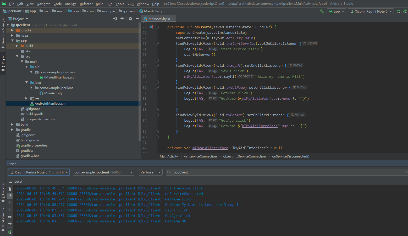import com.example.ipcservice.IMyAidlInterfaceclass MainActivity : AppCompatActivity() {companion object {private const val TAG = "LogClient"}override fun onCreate(savedInstanceState: Bundle?) {super.onCreate(savedInstanceState)setContentView(R.layout.activity_main)findViewById(R.id.tvStartService).setOnClickListener {Log.d(TAG, "StartService click")startMyServer()}findViewById(R.id.tvSayHi).setOnClickListener {Log.d(TAG, "SayHi click")mIMyAidlInterface?.sayHi("Hello my name is Pitt")}findViewById(R.id.tvGetName).setOnClickListener {Log.d(TAG, "GetName click")Log.d(TAG, "GetName ${mIMyAidlInterface?.name ?: ""}")}findViewById(R.id.tvGetAge).setOnClickListener {Log.d(TAG, "GetAge click")Log.d(TAG, "GetName ${mIMyAidlInterface?.age ?: ""}")}}private var mIMyAidlInterface: IMyAidlInterface? = null// 继承 ServiceConnectionprivate val serviceConnection = object : ServiceConnection {override fun onServiceDisconnected(name: ComponentName?) {// 服务断开Log.d(TAG, "onServiceDisconnected")mIMyAidlInterface = null}override fun onServiceConnected(name: ComponentName?, service: IBinder?) {Log.d(TAG, "onServiceConnected")// 服务连接成功 通过 Stub.asInterface 获取服务mIMyAidlInterface = IMyAidlInterface.Stub.asInterface(service)}}// 启动绑定服务private fun startMyServer() {val intent = Intent()// 包名 必须是我们新建aidl 的包名,因为这个包名也是服务对应的包名intent.setPackage("com.example.ipcservice")// 对应服务intent.action = "com.example.ipcservice.MyService"// 绑定服务applicationContext.bindService(intent, serviceConnection, Context.BIND_AUTO_CREATE)}