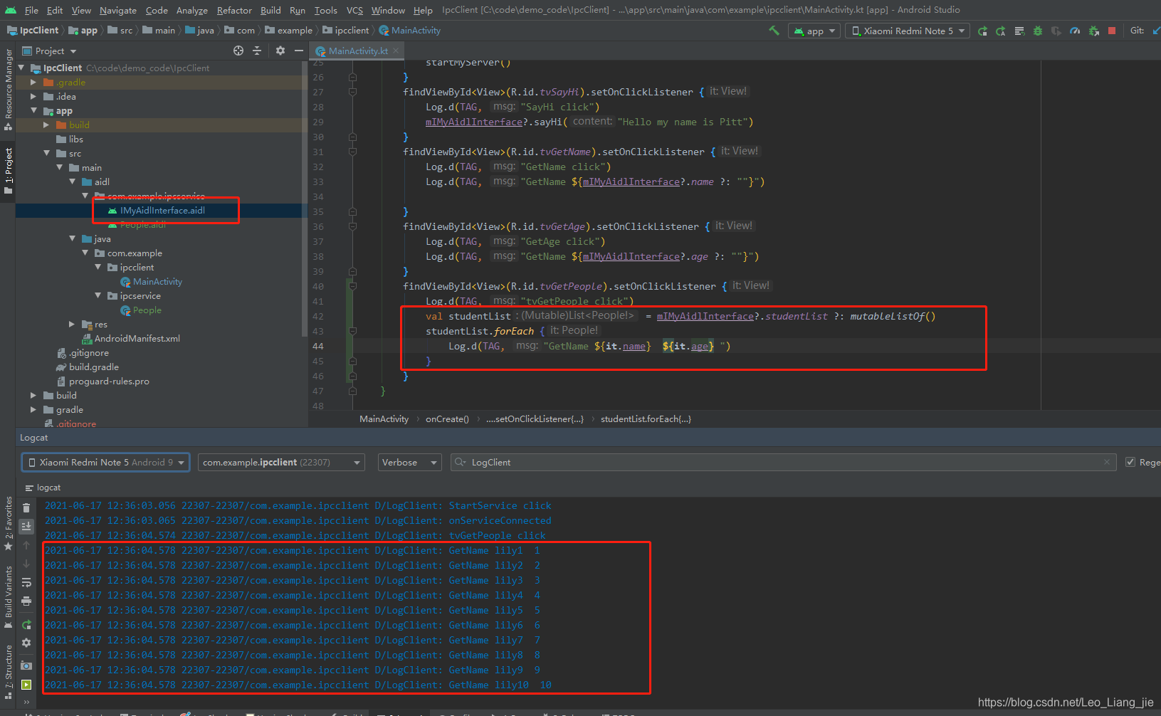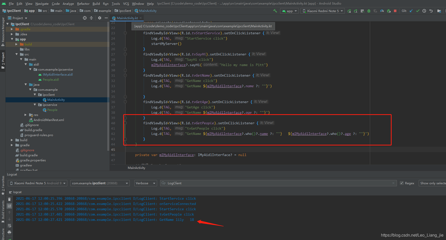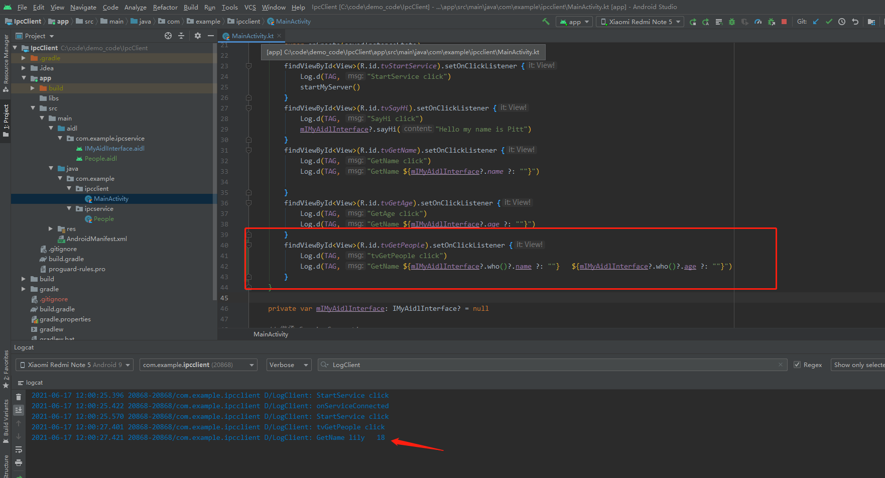 import com.example.ipcservice.IMyAidlInterfaceclass MainActivity : AppCompatActivity() {companion object {private const val TAG = "LogClient"}override fun onCreate(savedInstanceState: Bundle?) {super.onCreate(savedInstanceState)setContentView(R.layout.activity_main)findViewById(R.id.tvStartService).setOnClickListener {Log.d(TAG, "StartService click")startMyServer()}findViewById(R.id.tvSayHi).setOnClickListener {Log.d(TAG, "SayHi click")mIMyAidlInterface?.sayHi("Hello my name is Pitt")}findViewById(R.id.tvGetName).setOnClickListener {Log.d(TAG, "GetName click")Log.d(TAG, "GetName ${mIMyAidlInterface?.name ?: ""}")}findViewById(R.id.tvGetAge).setOnClickListener {Log.d(TAG, "GetAge click")Log.d(TAG, "GetName ${mIMyAidlInterface?.age ?: ""}")}}private var mIMyAidlInterface: IMyAidlInterface? = null// 继承 ServiceConnectionprivate val serviceConnection = object : ServiceConnection {override fun onServiceDisconnected(name: ComponentName?) {// 服务断开Log.d(TAG, "onServiceDisconnected")mIMyAidlInterface = null}override fun onServiceConnected(name: ComponentName?, service: IBinder?) {Log.d(TAG, "onServiceConnected")// 服务连接成功 通过 Stub.asInterface 获取服务mIMyAidlInterface = IMyAidlInterface.Stub.asInterface(service)}}// 启动绑定服务private fun startMyServer() {val intent = Intent()// 包名 必须是我们新建aidl 的包名,因为这个包名也是服务对应的包名intent.setPackage("com.example.ipcservice")// 对应服务intent.action = "com.example.ipcservice.MyService"// 绑定服务applicationContext.bindService(intent, serviceConnection, Context.BIND_AUTO_CREATE)}