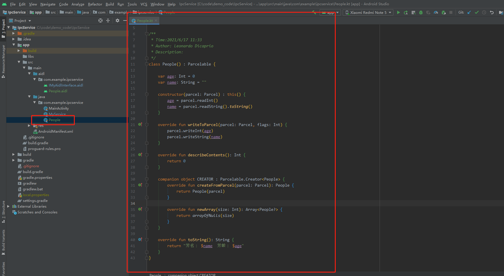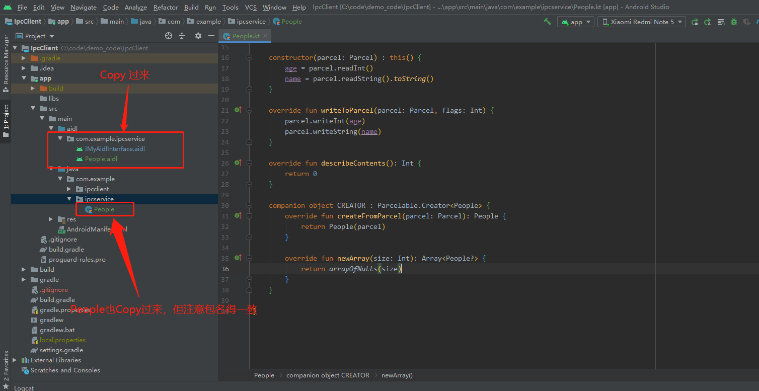 class People() : Parcelable {var age: Int = 0var name: String = ""constructor(parcel: Parcel) : this() {age = parcel.readInt()name = parcel.readString().toString()}override fun writeToParcel(parcel: Parcel, flags: Int) {parcel.writeInt(age)parcel.writeString(name)}override fun describeContents(): Int {return 0}companion object CREATOR : Parcelable.Creator {override fun createFromParcel(parcel: Parcel): People {return People(parcel)}override fun newArray(size: Int): Array {return arrayOfNulls(size)}}override fun toString(): String {return "芳名: $name 芳龄: $age"}
