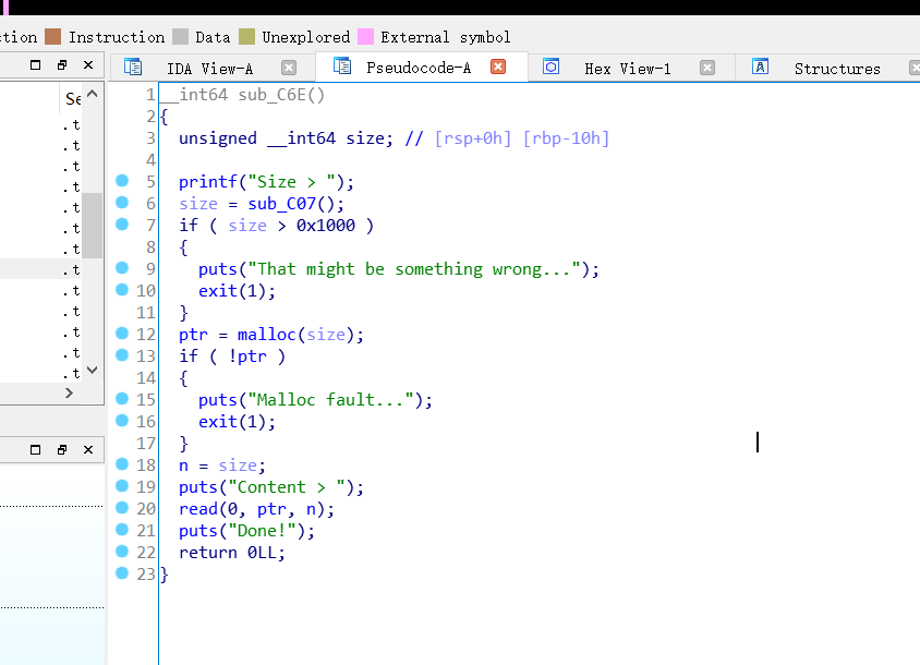 main_arena = u64(p.recv(6) + '\x00\x00') - 1640