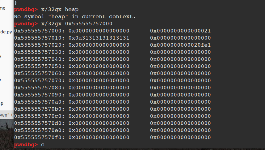 在这里我开辟了一个0x24大小的堆之后,便覆盖Topchunk,但为了 满足内存对齐机制覆盖最小的值为0xfe1