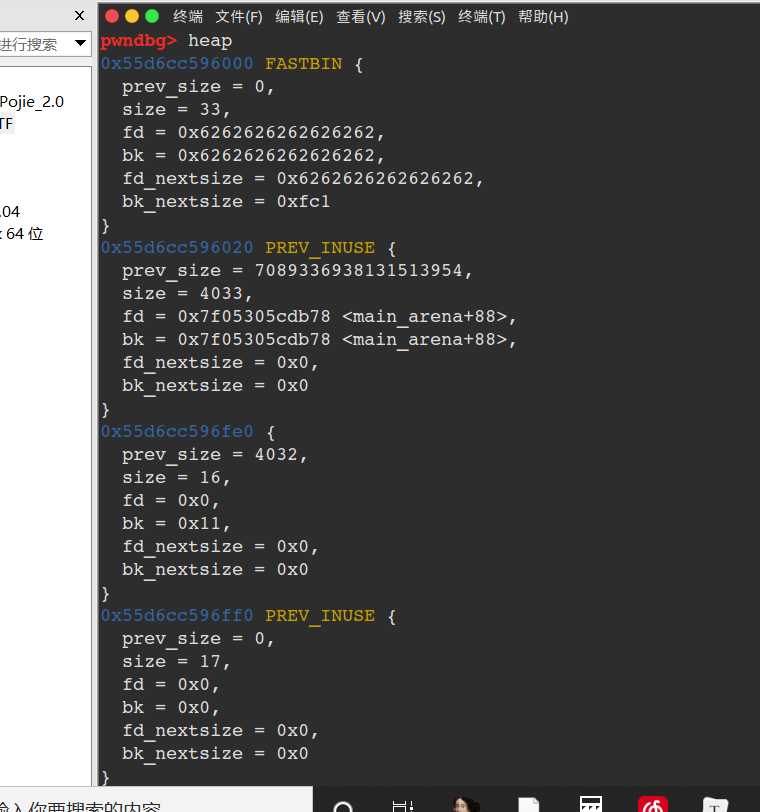 3.之后分配一个内存大于0xfe0的内存,topchunk无法满足分配的内存大小,堆以brk的形式拓展,topchunk会被置入unsorted bin中
