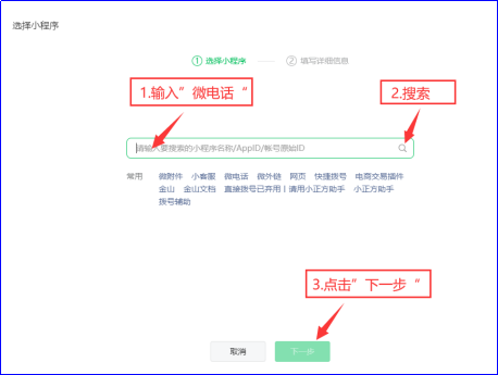2点击“小程序”(如图2),输入“微电话”,点击“下一步”。