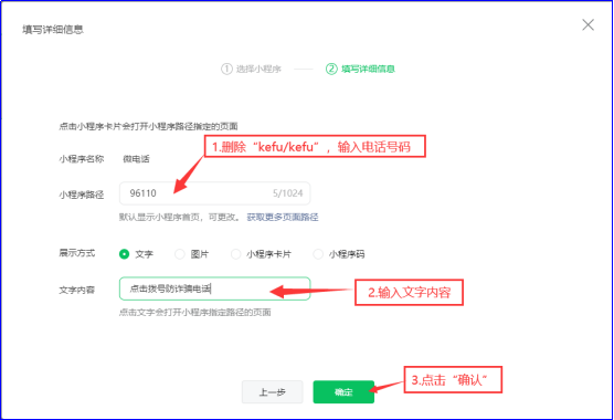 3将“小程序路径”选框中的字母清除,将想要添加的电话号码输入进去(如图3)。