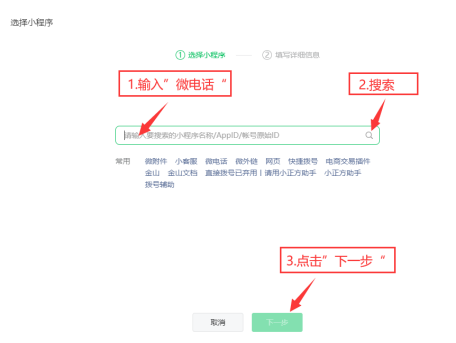 2点击“小程序”(如图2),输入“微电话”,点击“下一步”。
