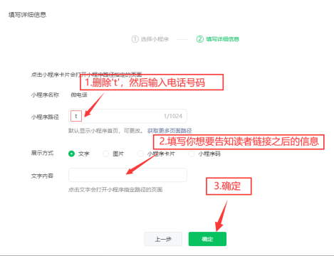 3将“小程序路径”选框中的字母清除,将想要添加的电话号码输入进去(如图3)。