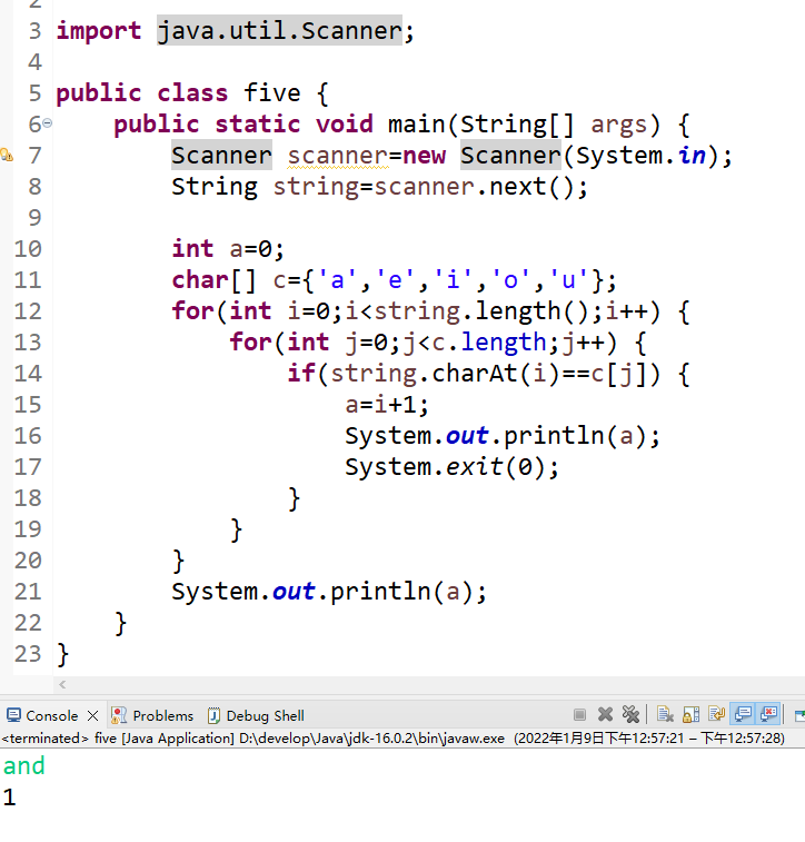 (Java蓝桥杯算法)返回给定字符串s中元音字母的首次出现位置。英语元音字母只有‘a’、‘e’、‘i’、‘o’、‘u’五个。