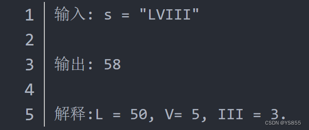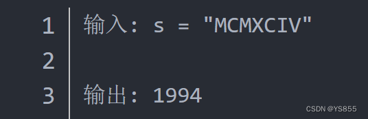 import java.util.Scanner;public class Roman {public static void main(String[] args) {Scanner scanner = new Scanner(System.in);System.out.println("请输入一个罗马字符:");String s = scanner.next();System.out.println("这个罗马字符对应的数字是:"+romanToInt(s));}//将罗马字符转化为数字public static int romanToInt(String s){//第一层花括号定义了一个继承于hashmap的匿名内部类;第二层花括号实际上是这个匿名内部类实例初始化块(或称为非静态初始化块)Map symbolValues = new HashMap() {{put('I', 1);put('V', 5);put('X', 10);put('L', 50);put('C', 100);put('D', 500);put('M', 1000);}};int ans =0;for(int i =0;i