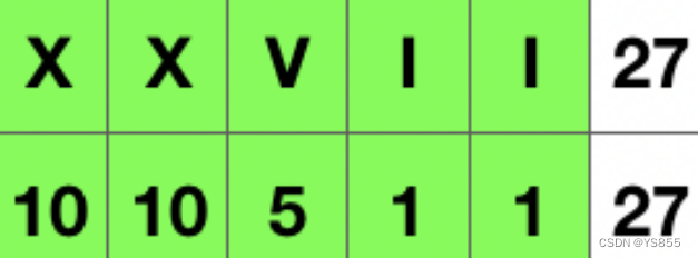 例如: 罗马数字 2 写做 II ,即为两个并列的 1 。12 写做 XII ,即为 X + II 。 27 写做 XXVII, 即为 XX + V + II 。
