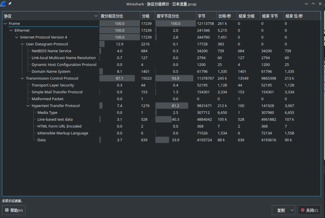 wireshark 统计中的协议分级是非常重要的,可以很清楚的看到这次捕获的数据主要是什么类型的。