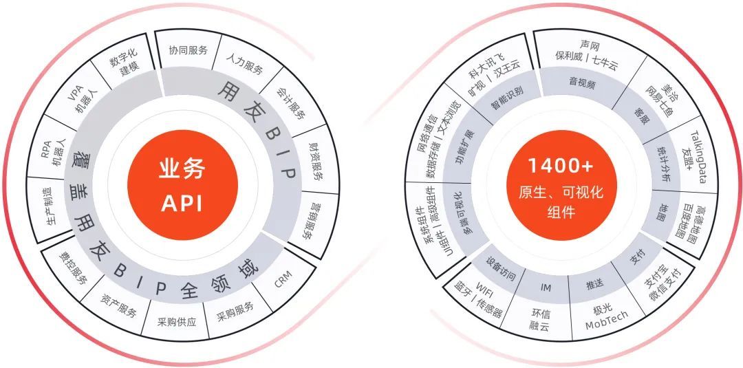 端API覆盖智能识别、音视频、客服、支付、物联网等领域的1400+原生模块,业务API覆盖用友BIP全领域,让企业应用程序构建,不受任何行业限制。