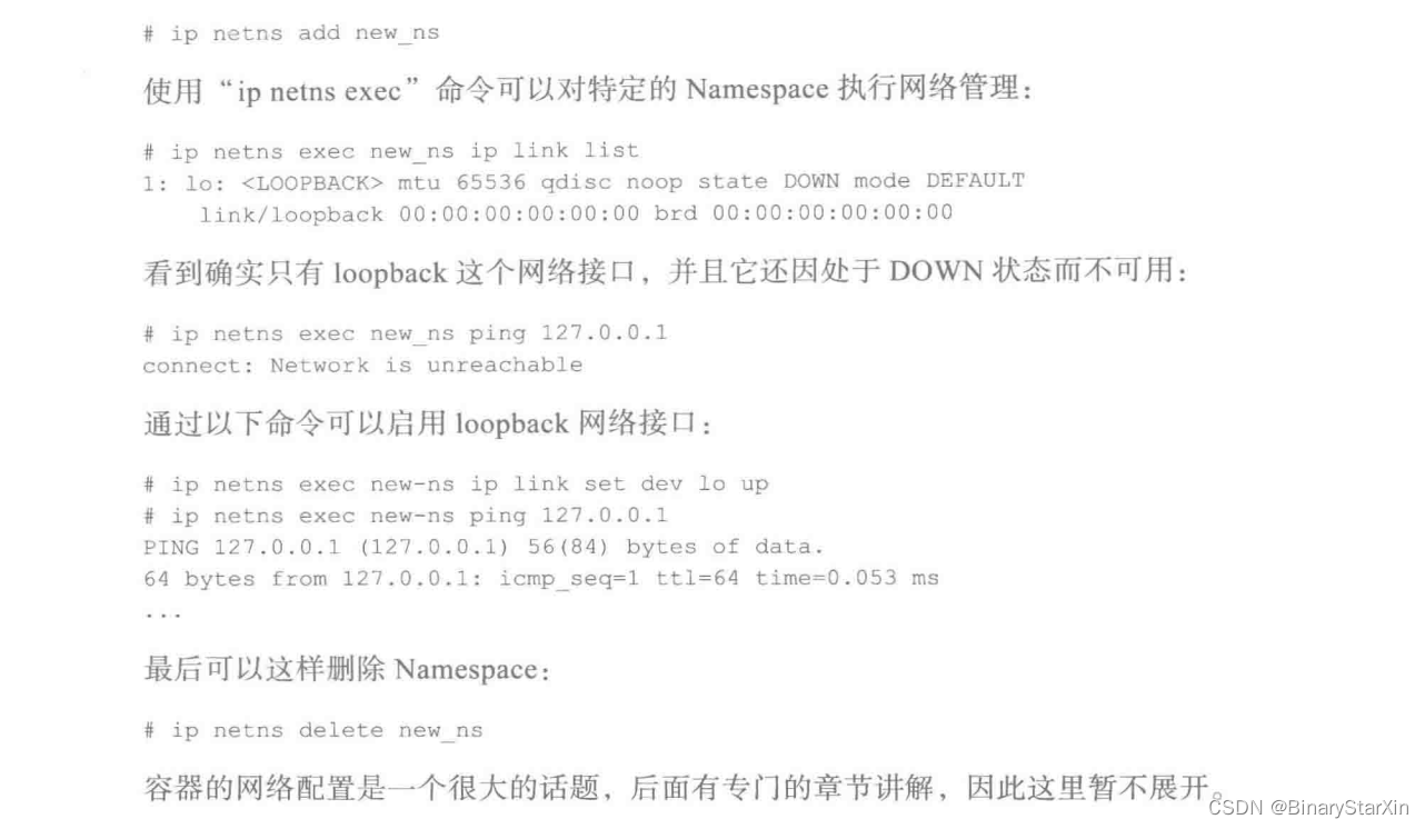 5、Network Namespace这个Namespace会对网络相关的系统资源进行隔离,每个Network Namespace都有自己的网络设备IP地址、路由表、/proc/net 目录、端口号等。网络隔离的必要性是很明显的.举一个例子,在没有隔离的情况下,如果两个不同的容器都想运行同一个 Web 应用,而这个应用又需要使用80端口,那就会有冲突了。新创建的Network Namespace 会有一个loopback设备,除此之外不会有任何其他网络设备,因此用户需要在这里面做自己的网络配置。IP工具已经支持Network Namespace,可以通过它来为新的Network Namespace配置网络功能。首先创建Network Namespace: