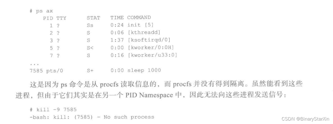 当创建一个PIDNamespace 时,第一个进程的PID号是1,也就是init进程。init进程有一些特殊之处,例如init 进程需要负责回收所有孤儿进程的资源。另外,发送给 imnit进程的任何信号都会被屏蔽,即使发送的是SIGKILL信号,也就是说,在容器内无法“杀死”init进程。