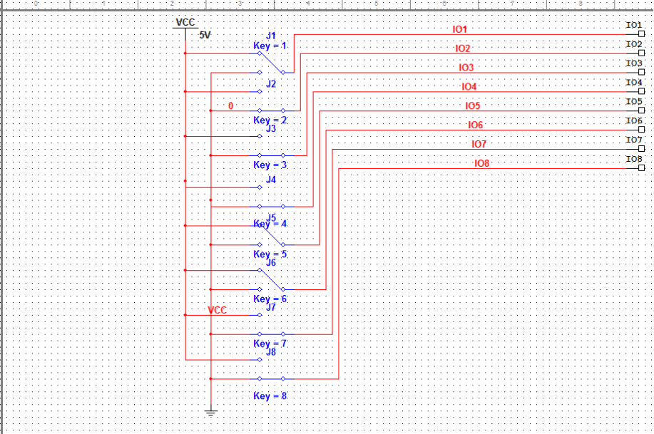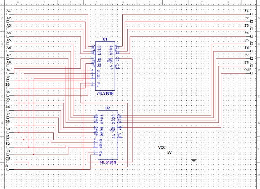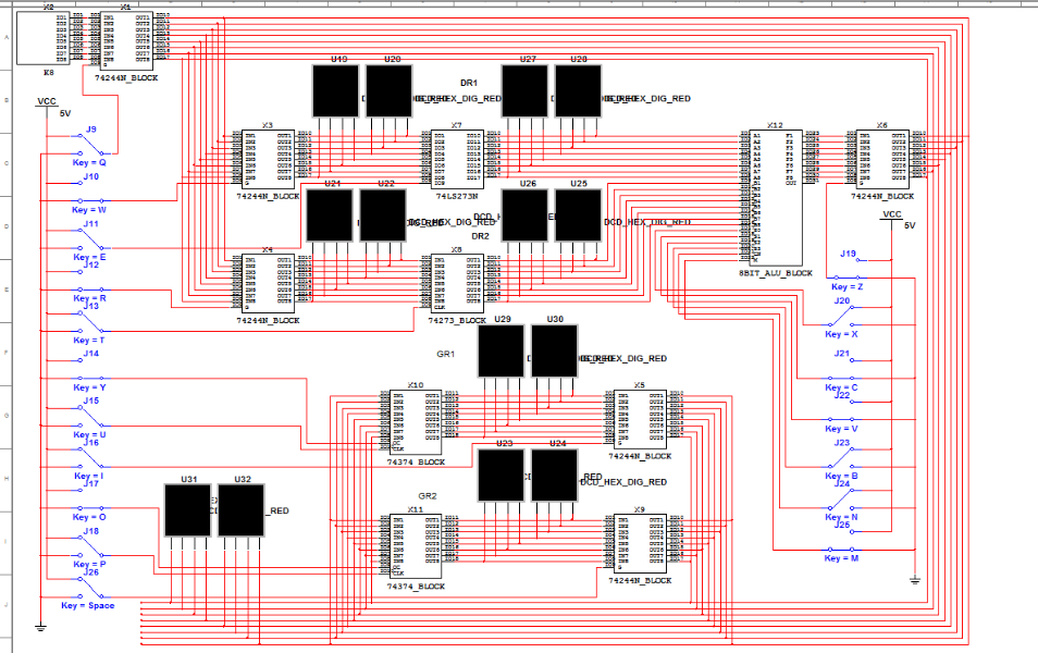电路图中,上右下三方的8条线模拟8位数据总线;K8产生所需数据;74244层次块为三态门电路,将部件与总线连接或断开,切记总线上只能有一个输入;两个74273层次块作为暂存工作寄存器DR1和DR2;两个74374层次块作为通用寄存器组(鉴于电路排列情况,只画出两个通用寄存器GR1和GR2,如果可能的话可设计4个或8个通用寄存器);众多的开关作为控制电平或打入脉冲;众多的8段代码管显示相应位置的数据信息;核心为8位ALU层次块。