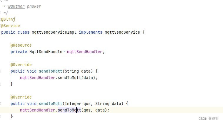 public interface MqttSendHandler {/*** 使用 Default Topic & Default Qos 发送数据** @param data string*/void sendToMqtt(String data);/*** 使用 Default Topic & 自定义 Qos 发送数据** @param qos 自定义 Qos* @param data string*/void sendToMqtt(@Header(MqttHeaders.QOS) Integer qos, String data);/*** 使用 自定义 Topic & Default Qos 发送数据** @param topic 自定义 Topic* @param data string*/void sendToMqtt(@Header(MqttHeaders.TOPIC) String topic, String data);/*** 使用 自定义 Topic & 自定义 Qos 发送数据** @param topic 自定义 Topic* @param qos 自定义 Qos* @param data string*/void sendToMqtt(@Header(MqttHeaders.TOPIC) String topic, @Header(MqttHeaders.QOS) Integer qos, String data);