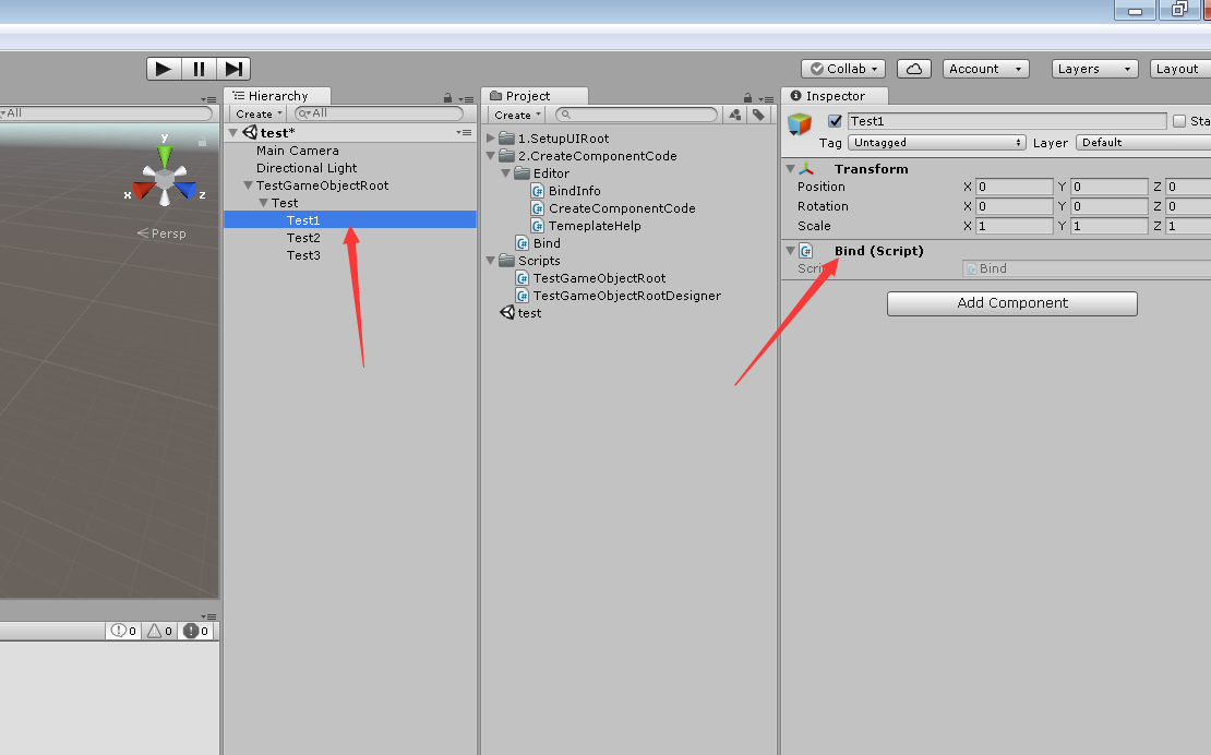 {//父物体下所有绑定脚本的子物体信息,父物体脚本会根据这些信息去判断声明几个成员变量public static List<BindInfo> mBindInfos = new List<BindInfo>();[MenuItem("GameObject/CreateCode",false,0)]static void CreateCode(){//获取选中的游戏物体var gameObject = Selection.objects.First() as GameObject;if (!gameObject){Debug.Log("请选择物体后再进行操作");return;}//保存脚本的路径var scriptFolder = Application.dataPath + "/Scripts";//判断路径是否存在if (!Directory.Exists(scriptFolder)){Directory.CreateDirectory(scriptFolder);}mBindInfos.Clear();//搜索所有绑定脚本的子物体,此处用到了递归//绑定信息需要寻找两次,一次用来创建脚本,一次用来赋值。之所以要寻找两次,是因为可能数据由于调用顺序会被覆盖SearchBinds("", gameObject.transform, mBindInfos);//创建父物体的脚本,创建两个,一个用来初始化,一个用来修改,使用了partial的修饰,创建的时候一个会判断当前文件是否存在,一个不会判断直接覆盖CompontTemplate.Write(gameObject.name, scriptFolder);CompontDesignerTemplate.Write(gameObject.name, scriptFolder, mBindInfos);EditorPrefs.SetString("GENERATE_CLASS_NAME", gameObject.name);AssetDatabase.Refresh();}static void SearchBinds(string path,Transform transform,List<BindInfo> binds){//判断该物体是否有绑定相应的脚本var bind = transform.GetComponent<Bind>();var isRoot = string.IsNullOrEmpty(path);//有并且不是根目录,则将这些信息添加到列表中if (bind && !isRoot){binds.Add(new BindInfo(){ FindPath = path });}foreach (Transform childTran in transform){SearchBinds(isRoot ? childTran.name : path + "/"+childTran.name, childTran, binds);}}//这个标签代表编译后再执行[DidReloadScripts] static void AddComponentToGameObject(){var generateClassName = EditorPrefs.GetString("GENERATE_CLASS_NAME");EditorPrefs.DeleteKey("GENERATE_CLASS_NAME");if(string.IsNullOrEmpty(generateClassName)){return;}else{//固定格式,没有营养的一部分代码,调用相关API,通过序列化给父物体绑定脚本以及初始化。var assemblies = AppDomain.CurrentDomain.GetAssemblies();var defaultAssembly = assemblies.First(assembly => assembly.GetName().Name == "Assembly-CSharp");var type = defaultAssembly.GetType(generateClassName);var gameObject = GameObject.Find(generateClassName);var scriptComponent = gameObject.GetComponent(type);if(!scriptComponent){scriptComponent = gameObject.AddComponent(type);}var serialiedScript = new SerializedObject(scriptComponent);mBindInfos.Clear();//绑定信息需要寻找两次,一次用来创建脚本,一次用来赋值。之所以要寻找两次,是因为可能数据由于调用顺序会被覆盖SearchBinds("", gameObject.transform, mBindInfos);foreach (var bindInfo in mBindInfos){ string name = bindInfo.FindPath.Split('/').Last();//寻找所有的物体serialiedScript.FindProperty(name).objectReferenceValue = GameObject.Find(name);//只寻找自身的子物体,减少性能消耗,有时会提示空引用,原因未知//serialiedScript.FindProperty(name).objectReferenceValue = gameObject.transform.Find(name).gameObject; }serialiedScript.ApplyModifiedPropertiesWithoutUndo();}}