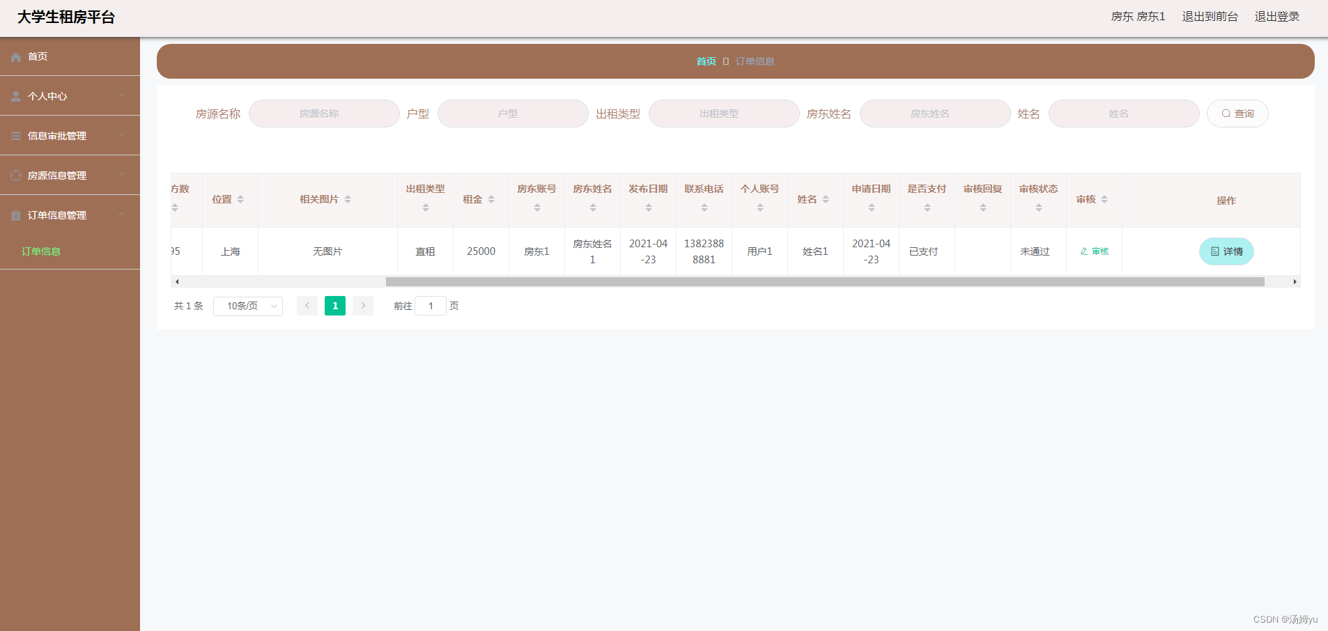 房东进入指定功能操作区之后可以管理订单信息。其页面见下图。用户租房后,房东需要查看用户是否支付,而且还要审核用户的租房订单。
