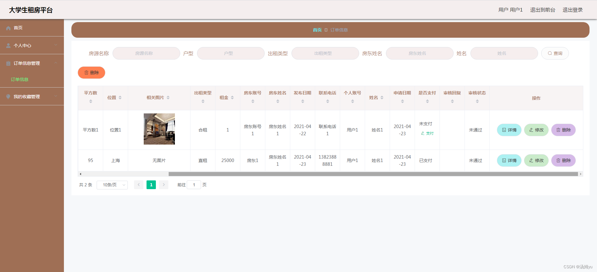 用户进入后台功能操作区之后可以查看订单信息。其页面见下图。用户支付未支付的租房订单,查看租房订单是否通过房东审核。
