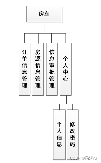 在前面分析的房东功能的基础上,进行接下来的设计工作,最终展示设计的房东结构图(见下图)。房东提交信息审批信息,发布房源信息,审核用户租房订单。
