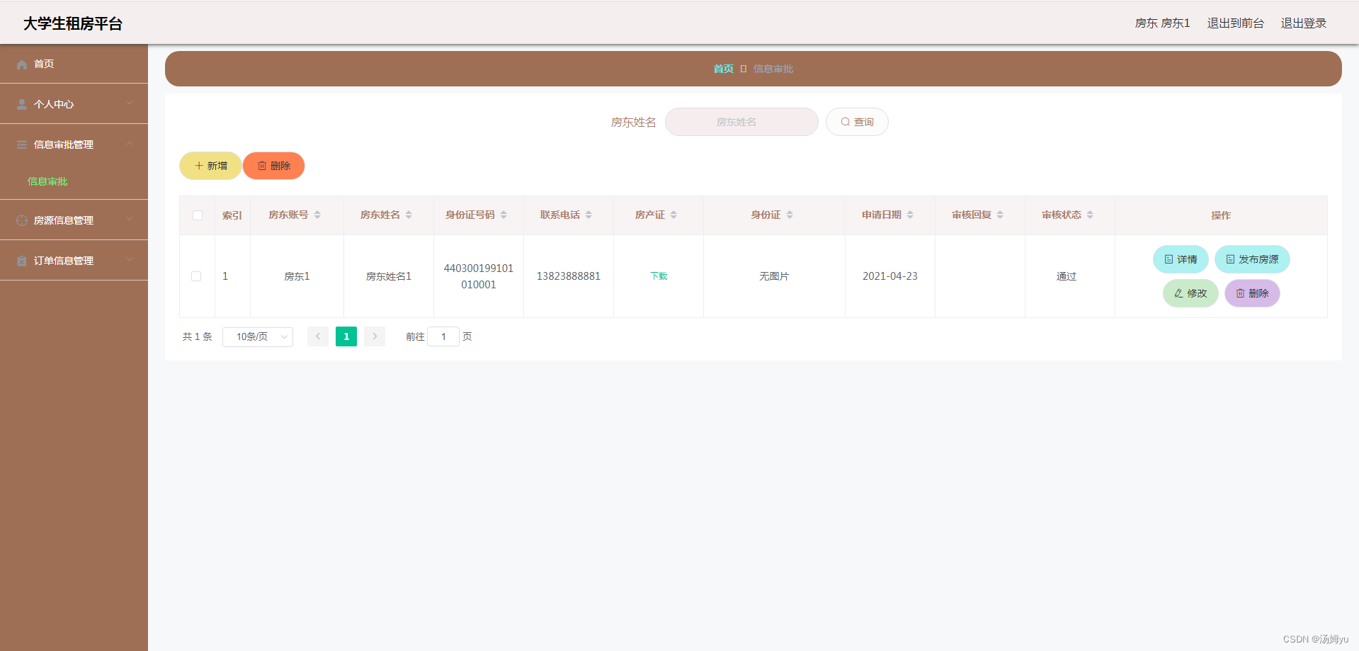 管理员进入指定功能操作区之后可以管理信息审批信息。其页面见下图。房东上传房产证和身份证信息,管理员查看后进行审批,审批通过之后,房东才可以发布房源信息。