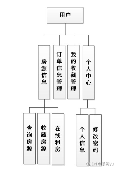 在前面分析的用户功能的基础上,进行接下来的设计工作,最终展示设计的用户结构图(见下图)。用户收藏房屋,租用房屋,支付租房订单。
