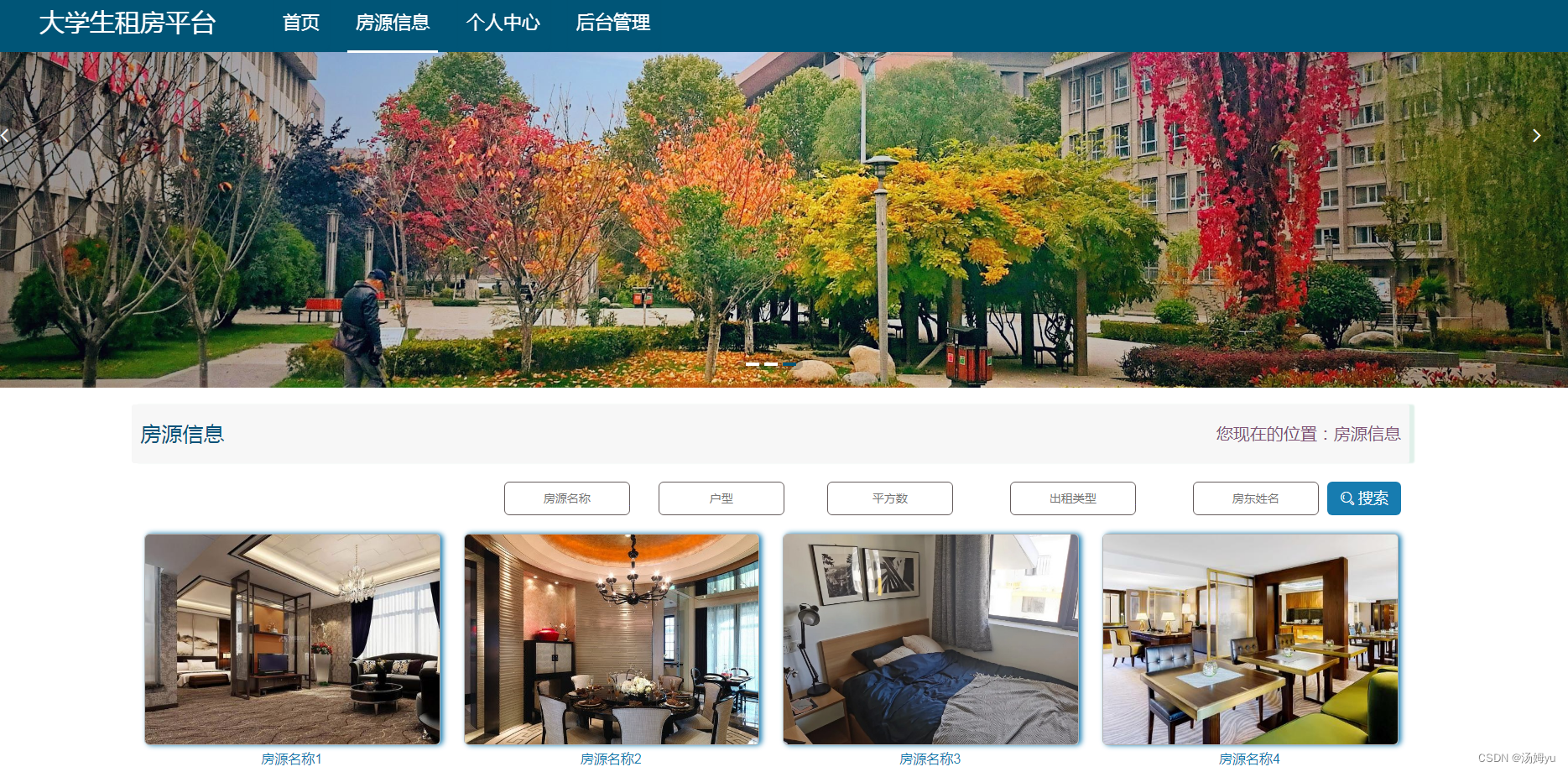 用户进入前台之后可以查看房源信息。其页面见下图。本页面显示所有要出租的房源信息,用户可以根据房源名称,户型,出租类型等字段查询所需房源信息。