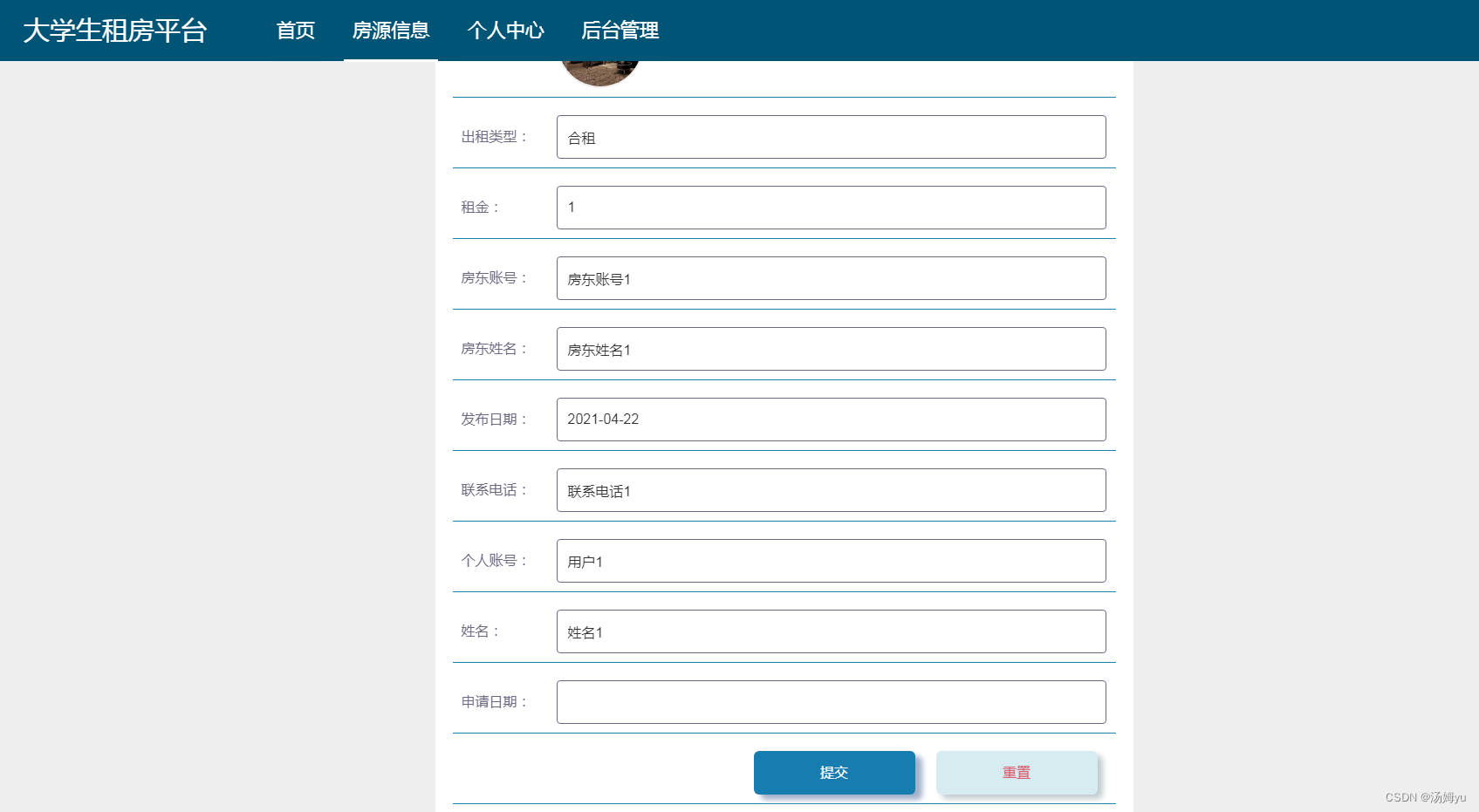 用户进入前台之后可以对需要的房源提交租房信息。其页面见下图。用户对需要的房源进行租房,提交租房信息时要设置申请日期。