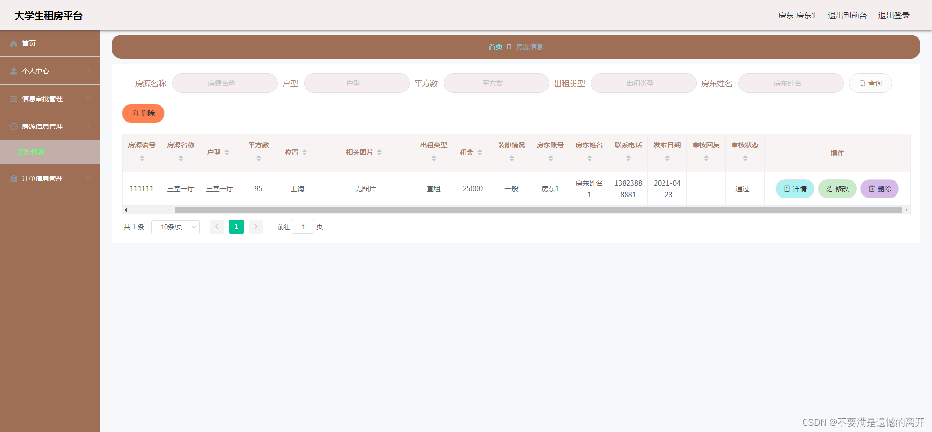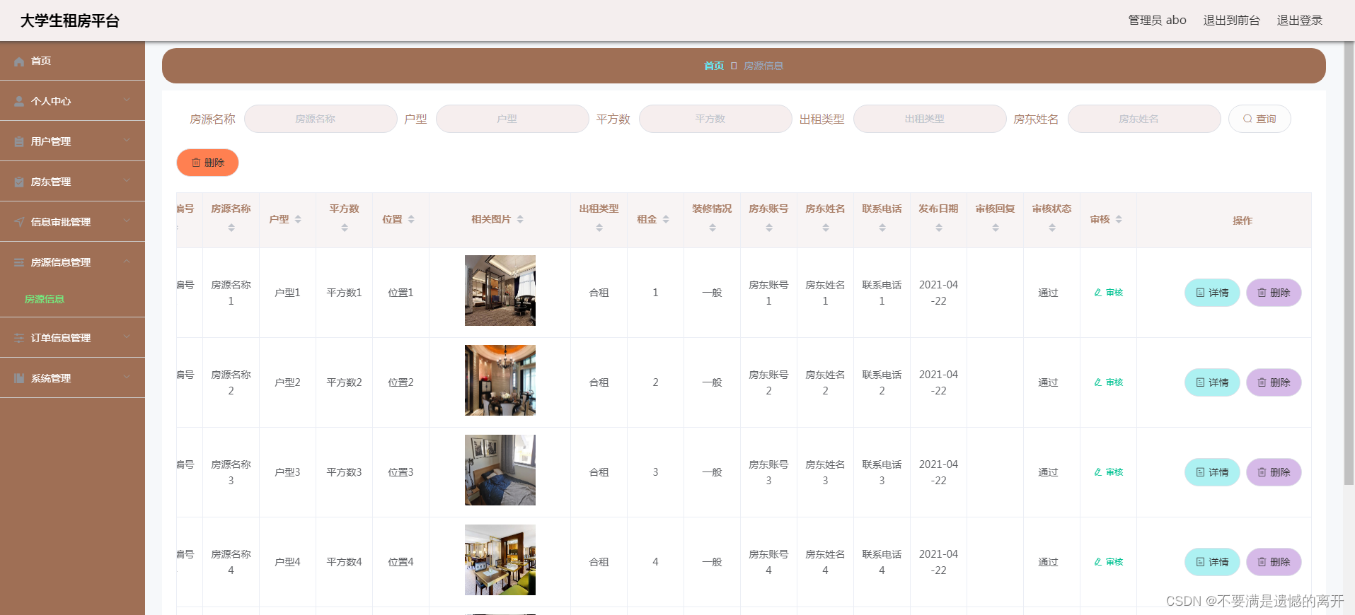 管理员进入指定功能操作区之后可以管理房源信息。其页面见下图。房东发布的房源信息需要先通过管理员的审核,然后才能展示在前台进行出租。