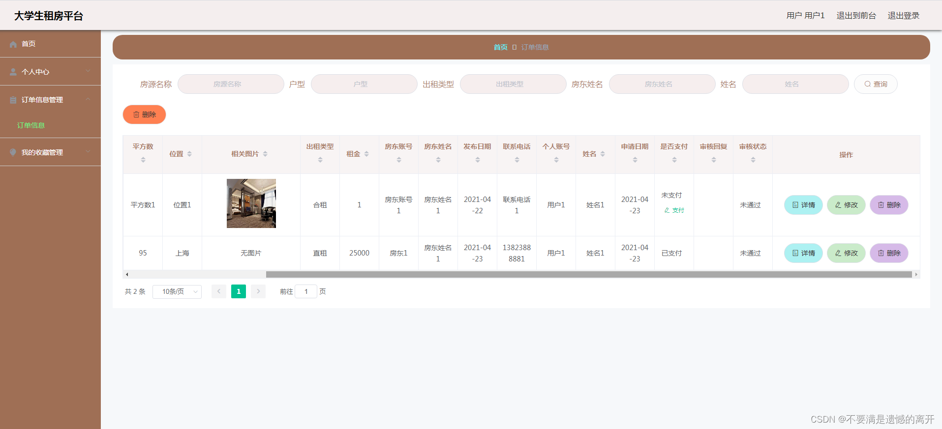 用户进入后台功能操作区之后可以查看订单信息。其页面见下图。用户支付未支付的租房订单,查看租房订单是否通过房东审核。