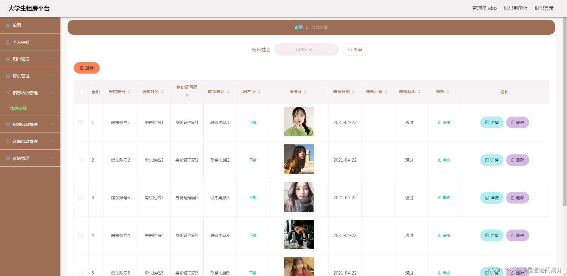管理员进入指定功能操作区之后可以管理信息审批信息。其页面见下图。房东上传房产证和身份证信息,管理员查看后进行审批,审批通过之后,房东才可以发布房源信息。