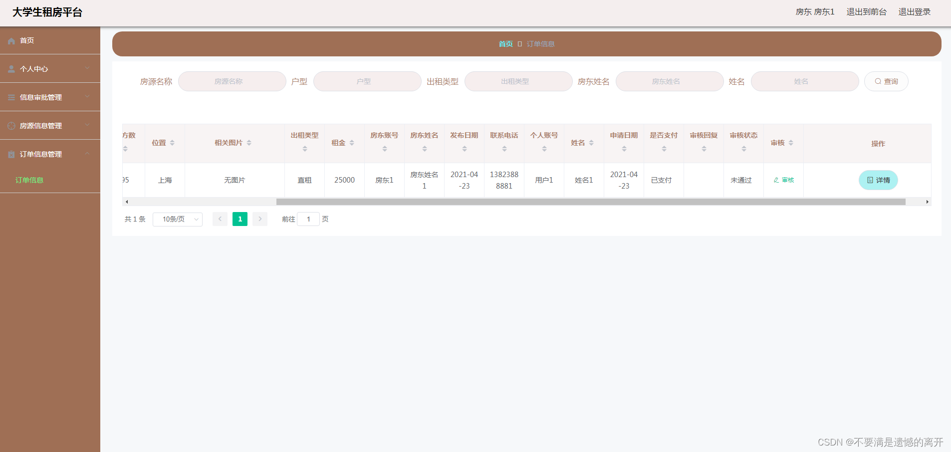 房东进入指定功能操作区之后可以管理订单信息。其页面见下图。用户租房后,房东需要查看用户是否支付,而且还要审核用户的租房订单。