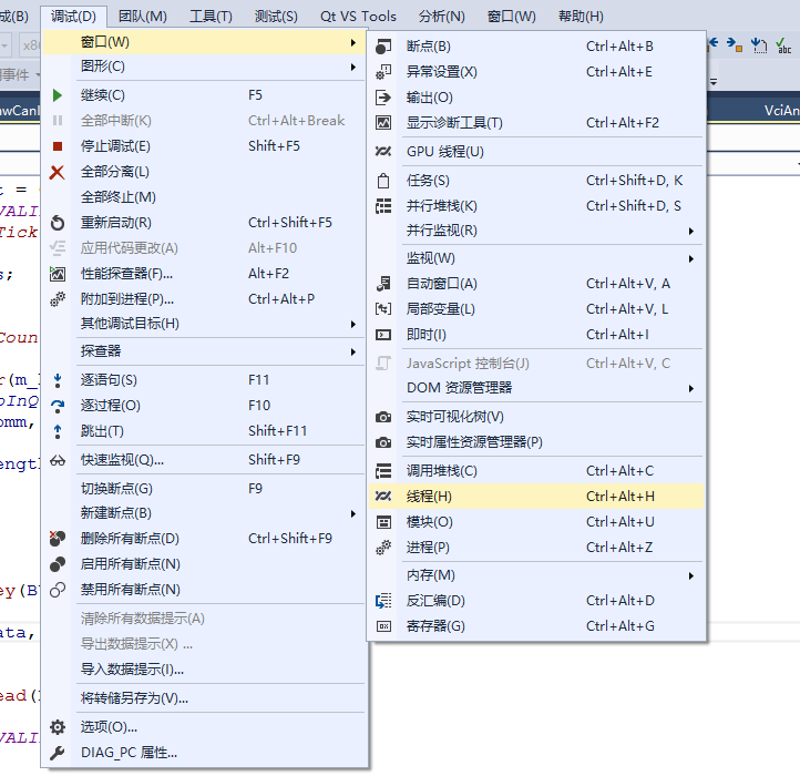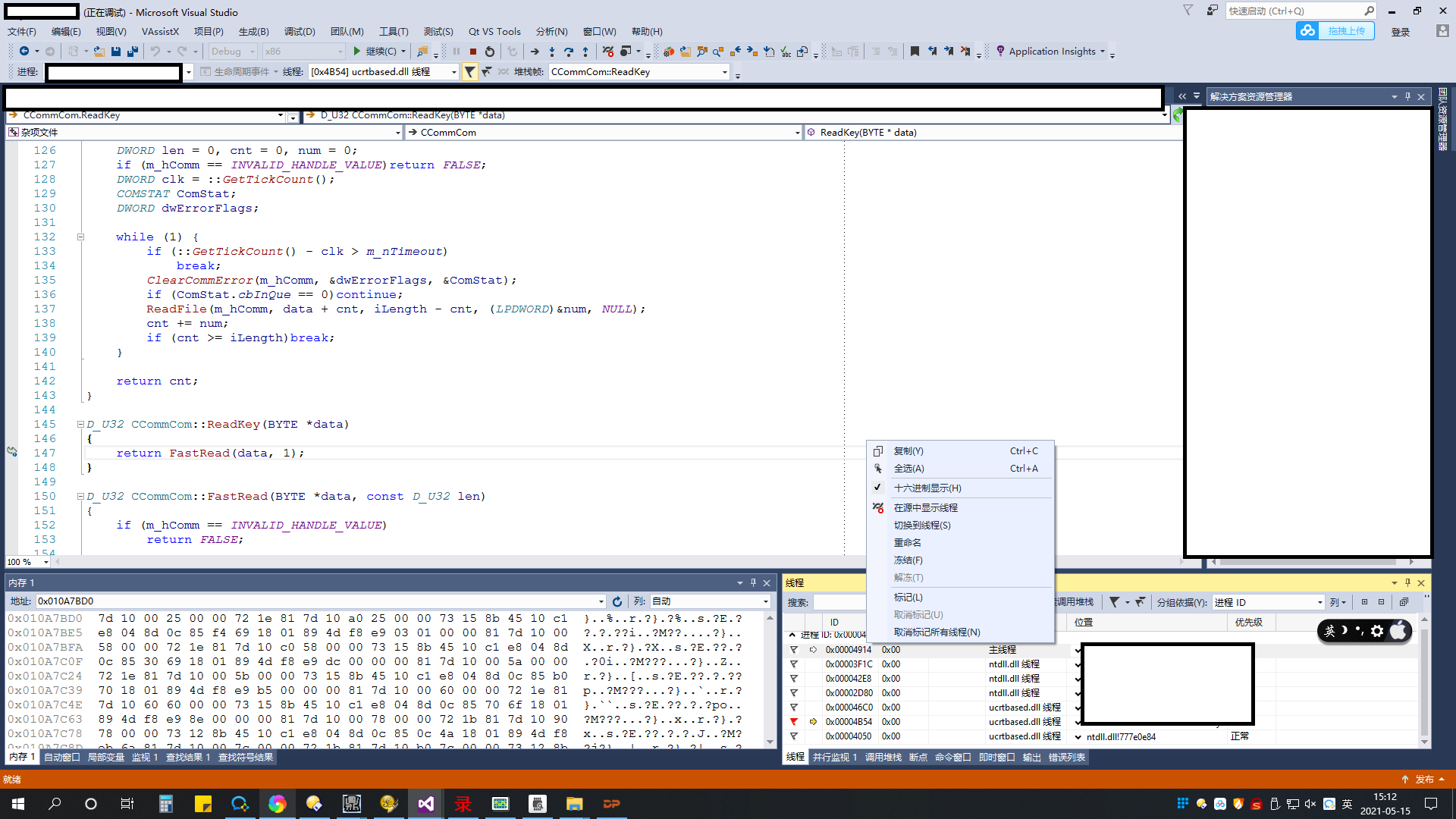 这里我的代码里有2个线程,一个线程在发送数据,另外一个线程在接收数据,上图中加断点的地方是发送线程的代码,接收线程中我有一个while循环在不断地打印日志。调试起来后当断点命中上图标记的位置时,可以发现接收线程停止打印日志了,这说明在VS中,当一个线程命中断点后,其它线程也不会再继续执行代码了。