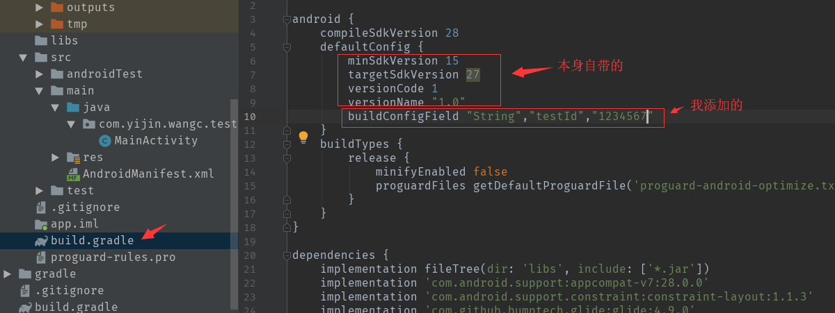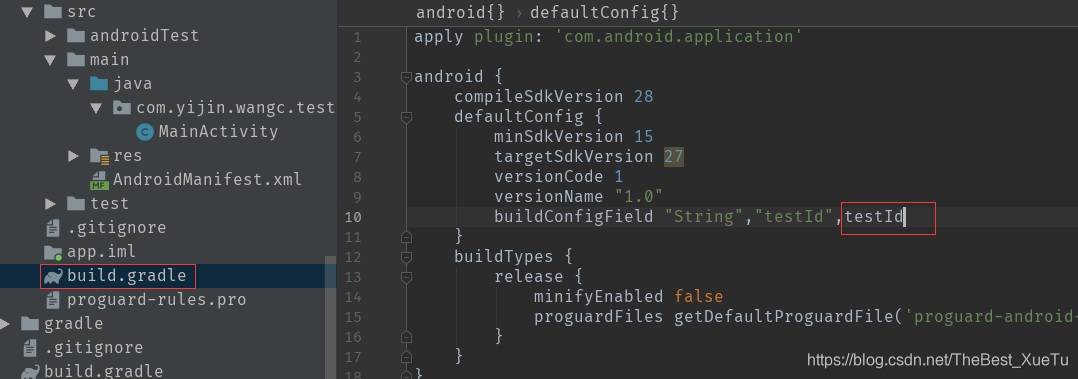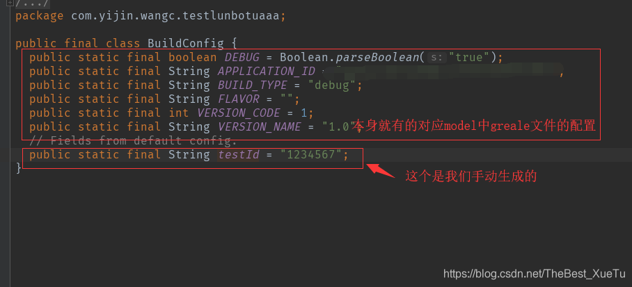 buildConfigField "String","testId","1234567" 分别表示