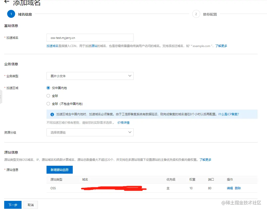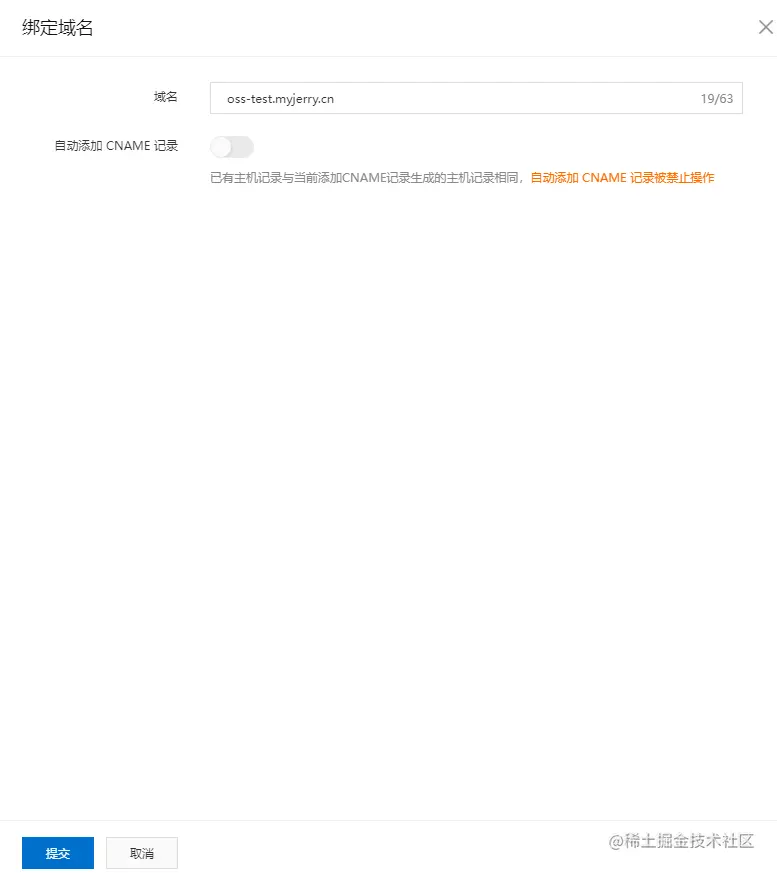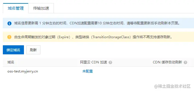 存储桶配置完成后,需要绑定自己的域名,虽然可以使用oss提供的存储桶域名,但在当前需求下是不能使用的。所以需要配置自己的域名。如下: