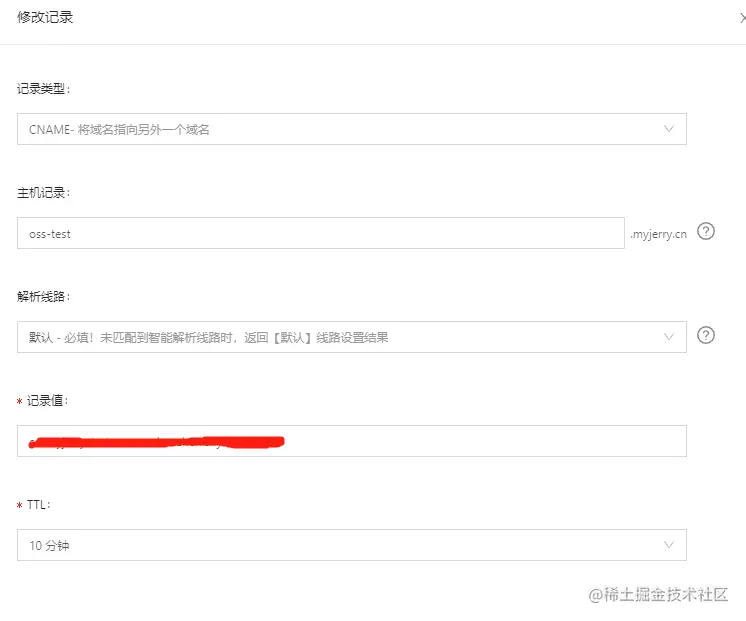 如果域名在当前账号下可直接勾选 自动添加 CNAME 记录,减少手动配置。如果域名没有在当前账号或者当前平台,需手动配置域名解析。如下: