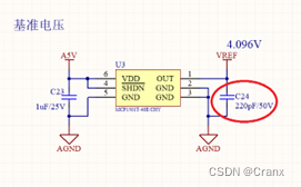 重点排查基准源电路图一所示,发现C24 220pF电容错误上成了1nF电容,更换物料号故障消失;